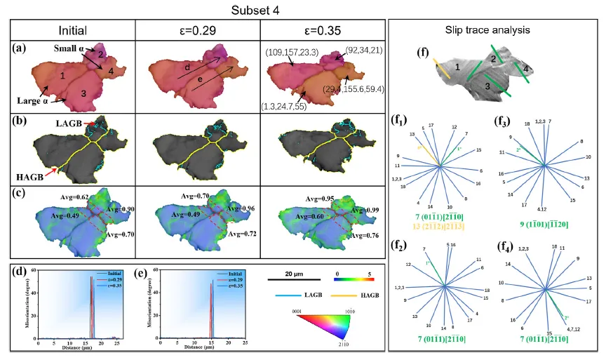 图10. 原位拉伸试验过程中子区域4的取向图(a)、晶界图(b)和KAM图(c)。(d,e)图(a)中标示线的取向差分布曲线。(f)35%变形后子区域4的SEM图像。(f₁-f₄)分别为晶粒1-4的18个滑移系计算理论可能滑移迹线与观察到的滑移迹线。最佳匹配被确定为已激活滑移系并显示在图中。