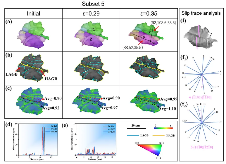 图11. 原位拉伸试验过程中子区域5的取向图(a)、晶界图(b)和KAM图(c)。(d,e)图(a)中标示线的取向差分布曲线。(f)35%变形后子区域5的SEM图像。(f₁,f₂)分别为晶粒1-2的18个滑移系计算理论可能滑移迹线与观察到的滑移迹线。最佳匹配被确定为已激活滑移系并显示在图中。