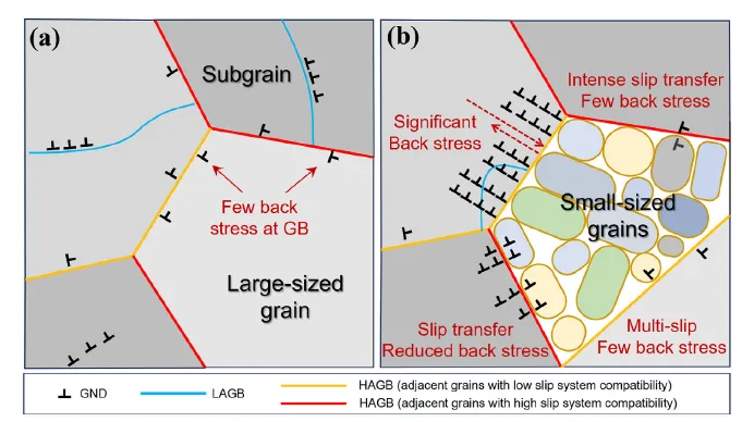 首要条件:存在晶粒尺寸差异机制:背应力源于“软”(粗晶)、“硬”(细晶)区域之间的变形不协调。只有存在明显的晶粒尺寸差异,软区在变形中才会产生更多位错。当这些位错向硬区运动时,会在晶界处被阻挡并堆积起来,从而在软区内部形成长程的背应力。证据:研究中的一个区域(子区5)显示,即使两个相邻粗晶间滑移配合很差,但由于它们尺寸相近、变形行为相似,并未在晶界处形成显著的位错堆积,说明缺乏尺寸差异这个“引擎”,背应力难以启动。