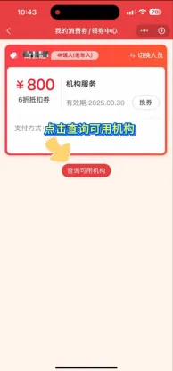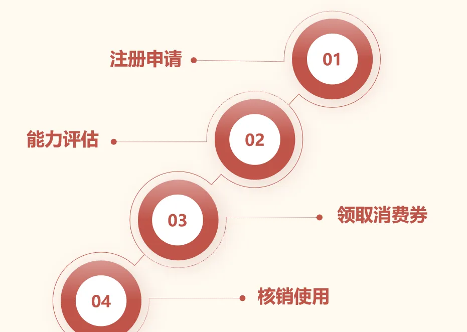 点击查询可用机构→选择服务机构→点击服务申请→选择服务分类预约时间→服务完成后按月和服务机构进行消费券核销。