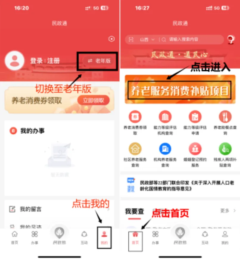 通过手机应用商店下载“民政通”APP或者通过微信/支付宝搜索“民政通”进入小程序(可在“我的”界面切换至老年版),在首页点击“养老服务消费补贴项目”。