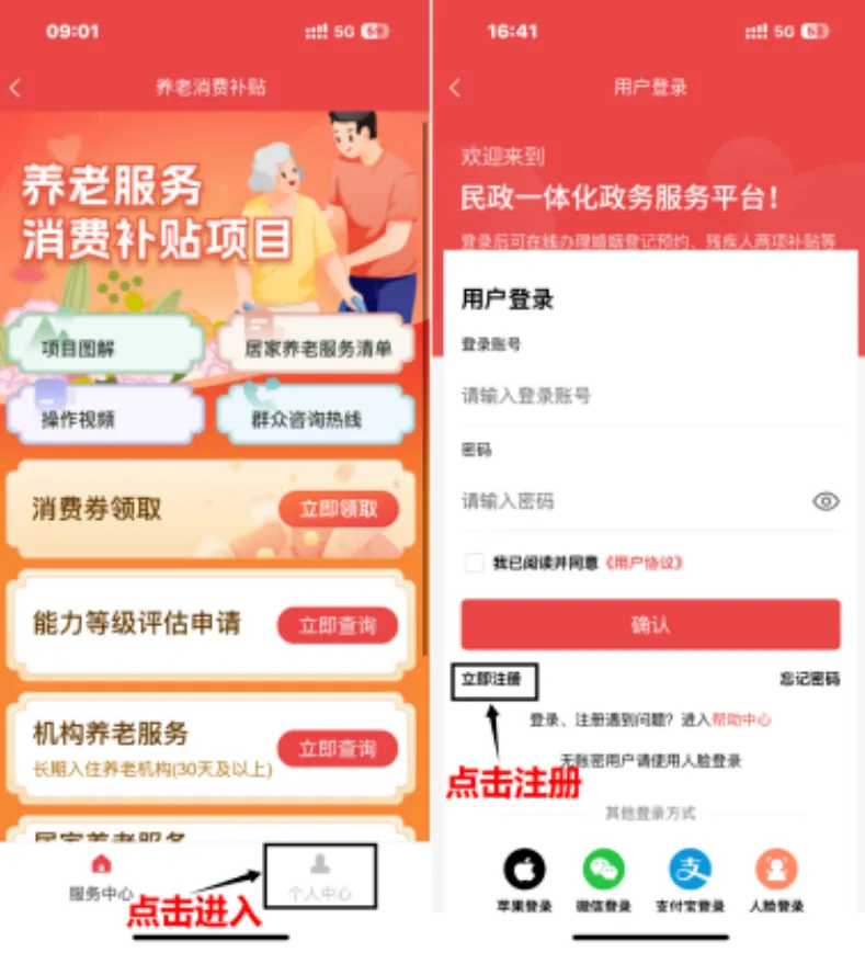 点击右下方“个人中心”进入登录页面,输入账号密码登录,若没有民政通账号密码,点击“立即注册”。