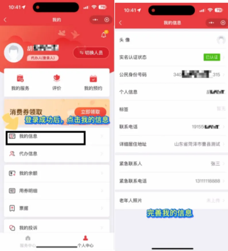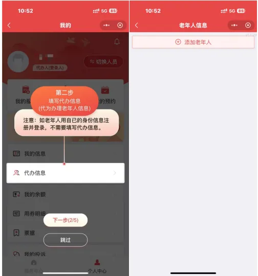 添加老人信息:在 “个人中心” 页面点击 “代办信息”→选择 “添加老年人”→按提示填写老人信息(姓名、身份证号等)→上传老人身份证正反面照片、正面照、侧面照、生活照→提交添加。(一个代办人最多可绑定12个老人信息,为老人代办时注意切换至该老人账号视角)。