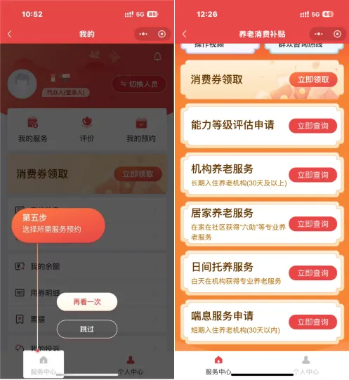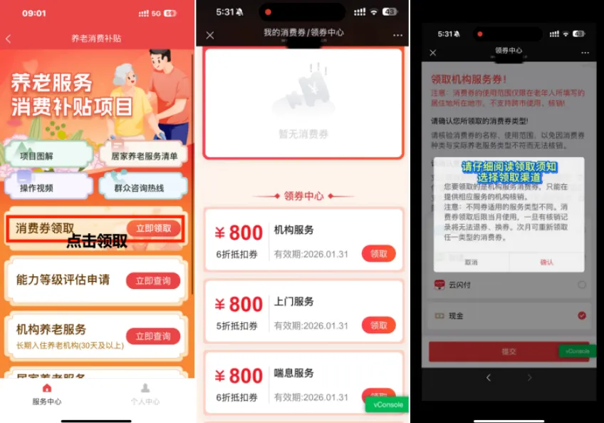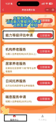 中度及以上失能老年人可进入“养老服务消费补贴项目”服务中心领取消费券。