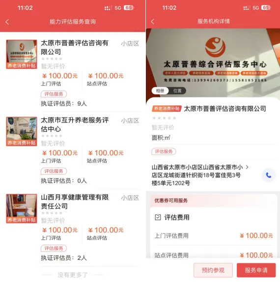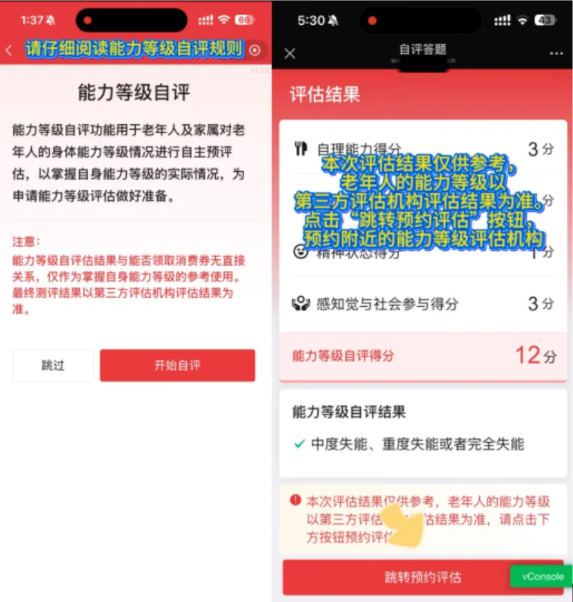 此处会有一个“能力等级自评”,点击开始自评,需要注意的是自评结果仅供参考(建议自评为中度及以上失能老年人后再申请第三方评估机构评估)老年人的能力等级以第三方评估机构评估结果为准,点击“跳转预约评估”,就近选择适合的第三方评估机构预约评估。