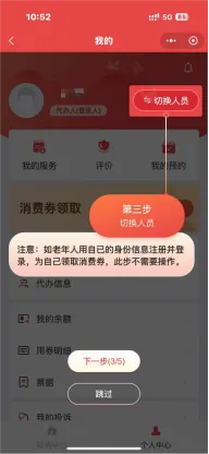 切换代办身份:在 “我的” 页面点击 “切换人员”→选择已添加的老人,切换至老人账号视角。