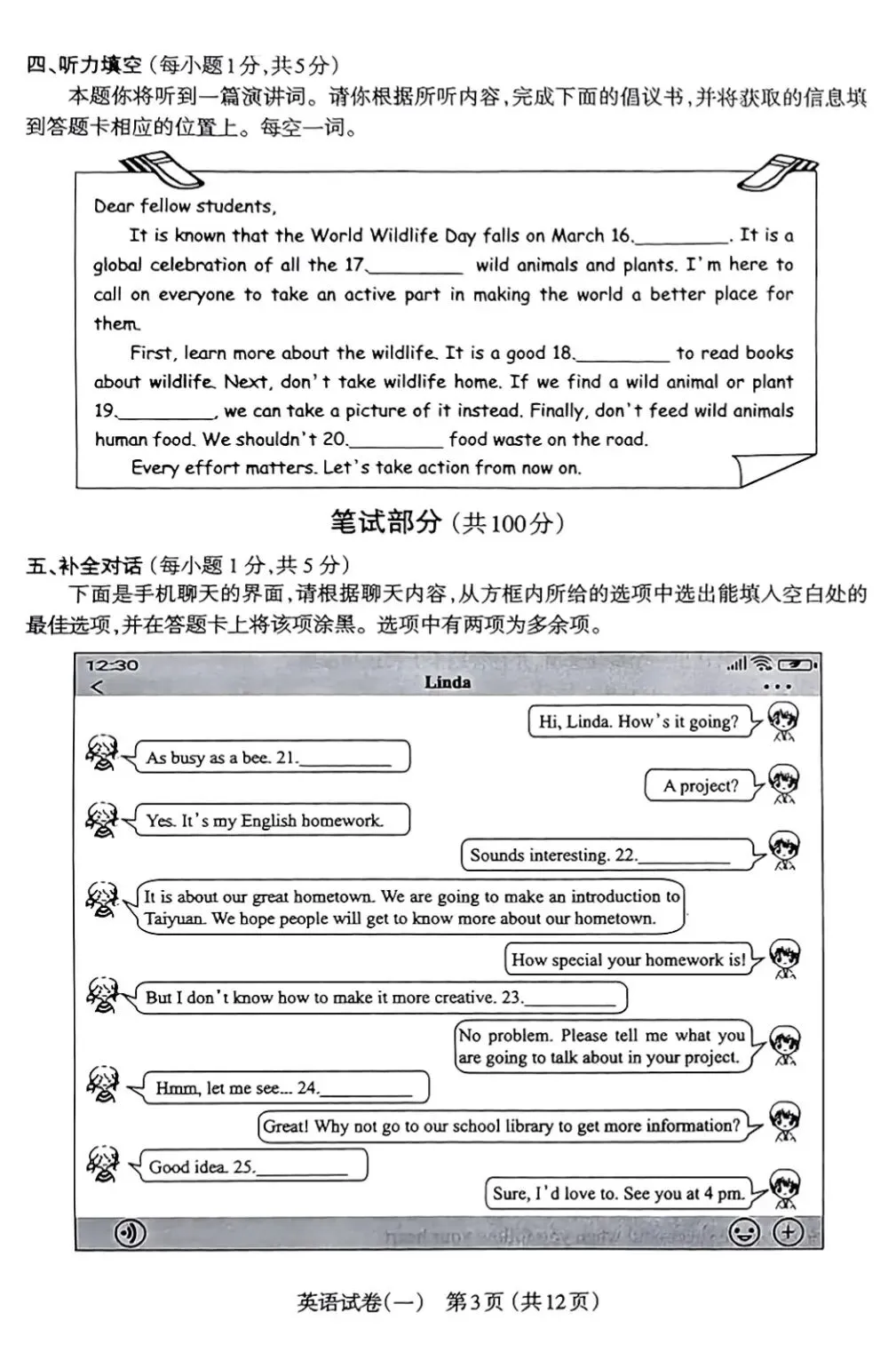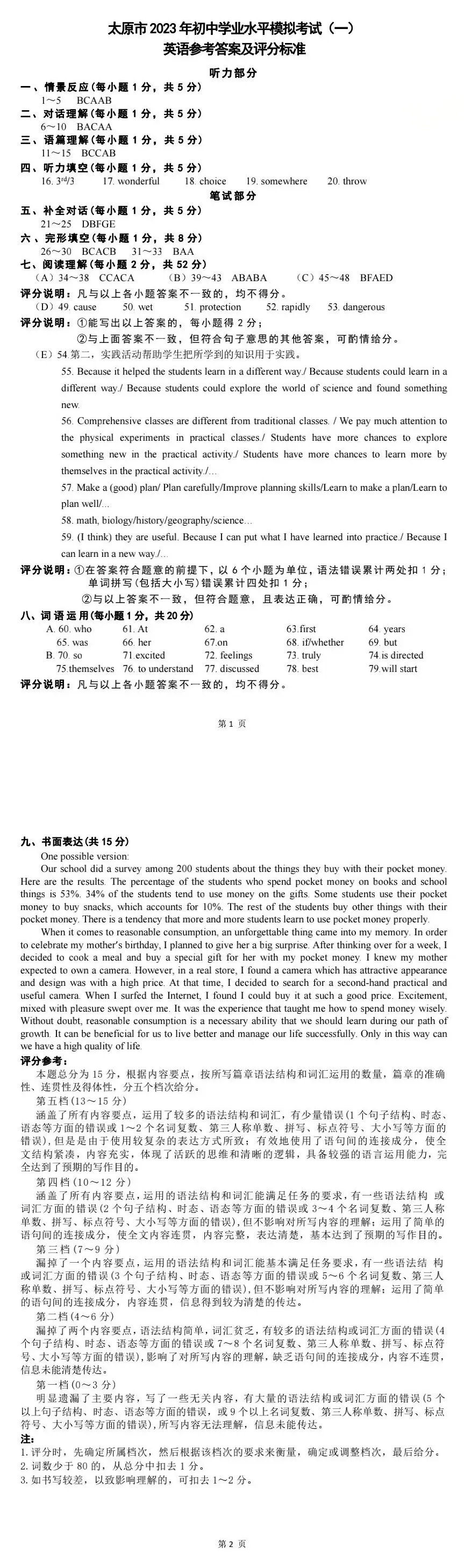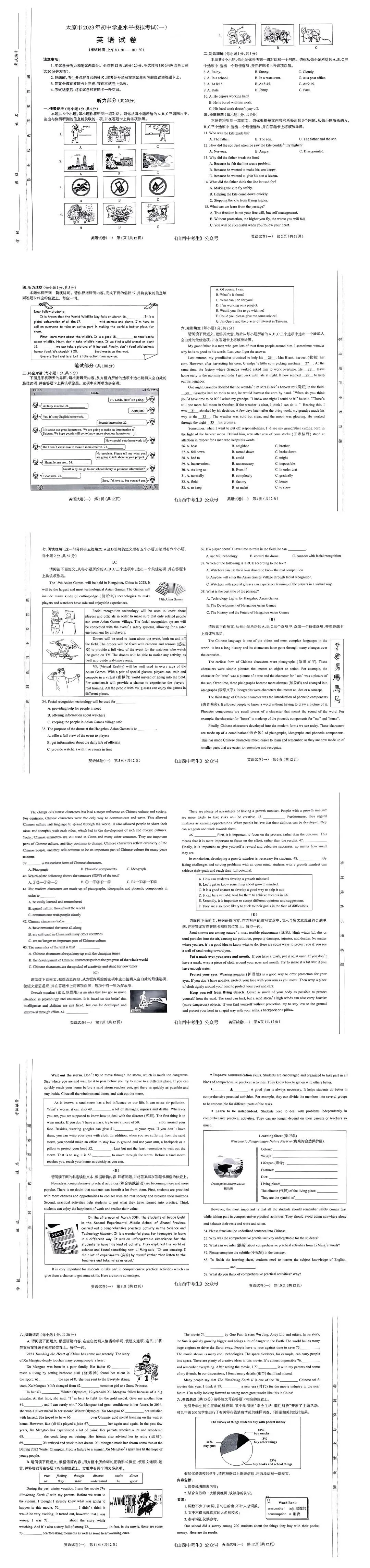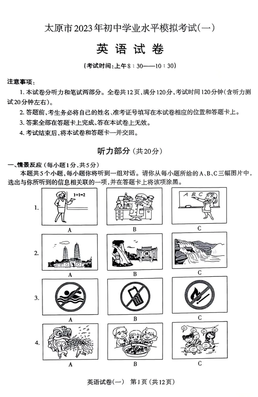 >【市一模】太原市2023年初中学业水平模拟考试(一)英语试卷+听力+答案