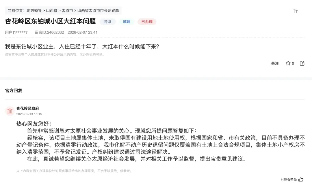 近日,有网友在领导留言板就“杏花岭区东铂城小区大红本问题”发起了咨询。网友咨询称:我是东铂城小区业主,入住已经十年了,大红本什么时候能下来?官方回复称:经核实,该项目土地属集体土地,未取得国有建设用地土地使用权,根据国家和省、市有关政策,目前不具备办理不动产登记条件。依据清零行动政策,我市化解不动产历史遗留问题仅覆盖国有土地上合法合规项目,集体土地小产权房不纳入清零范围,不予登记发证。产权纠纷建议通过司法途径解决。住在太原将持续关注更多其他小区大红本相关问题,敬请关注。买房看似简单的事儿,其实背后涵盖的信息量巨大宏观的包括经济、规划、金融、交通配套、教育、城市逻辑,微观的方面包含产品、户型、园林、入户大堂、装修、采光、噪音、容积率、烂尾风险等等。买房不入坑,欢迎加微信咨询太原买房那些事儿。
