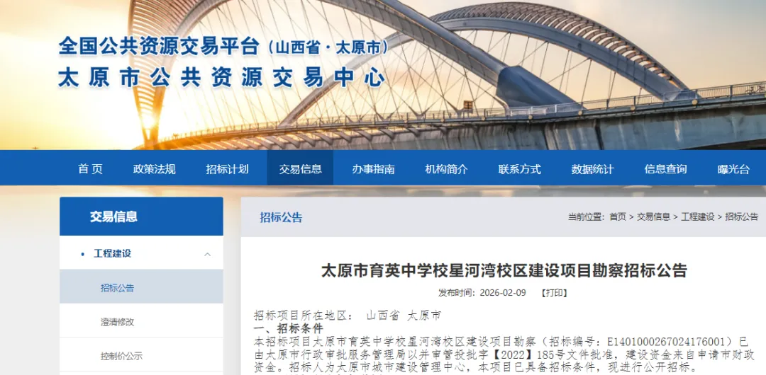 近日,全国公共资源交易平台正式发布《太原市育英中学校星河湾校区建设项目设计招标公告》与《太原市育英中学校星河湾校区建设项目勘察招标公告》。