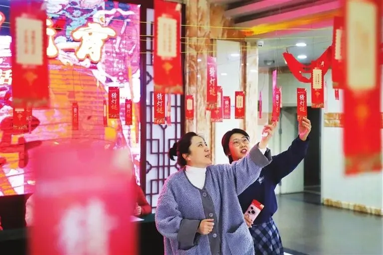 当日上午10时,活动拉开帷幕。一楼大厅内红色的谜条整齐悬挂,字谜、植物谜、动物谜、自然现象谜等各类谜题兼具知识性与趣味性。“两土两人两张口”“头戴红顶帽,身穿白布袄”等谜面,让参与者们驻足沉思、相互探讨,不时传来猜中谜底的欢呼声。