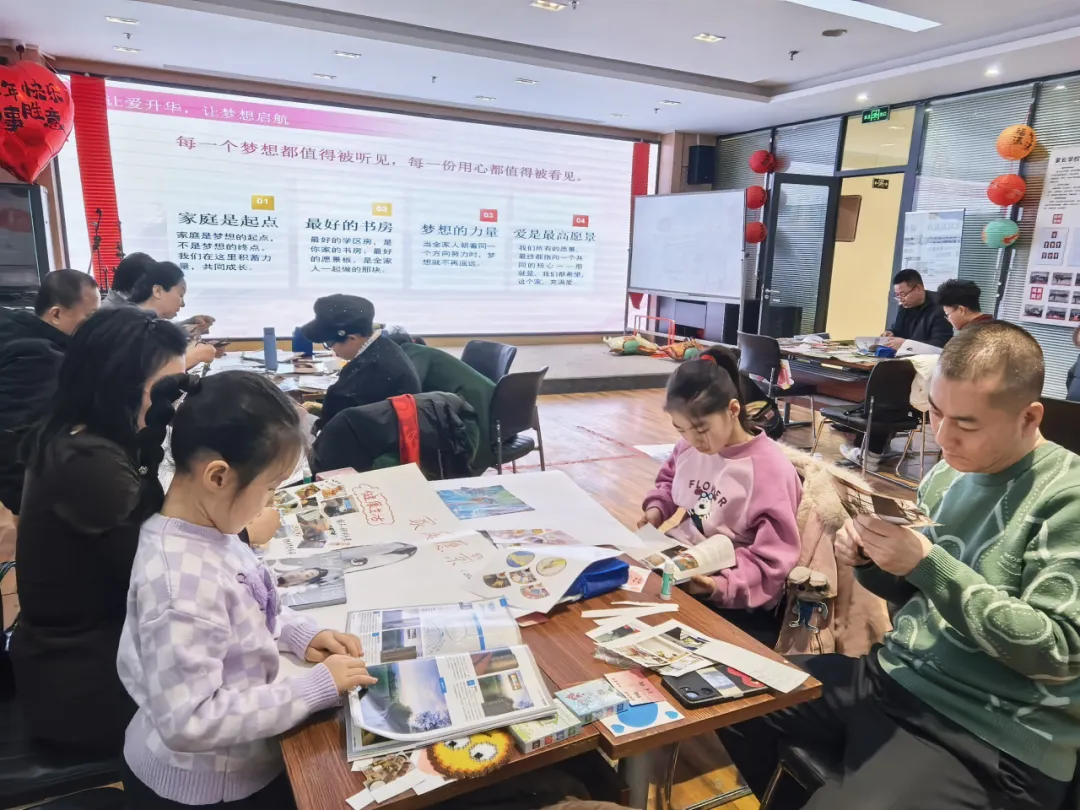 分享环节结束后,大家亲手制作家庭愿景板,制定家庭年度行动计划。根据指导老师的讲解和要求,将心中对家庭的期待、对美好生活的向往细心划分出家和人乐、书香润心、绿享生活、微光成炬、家之愿景等五大类,并将家庭美德、生活理想与成长目标融入创作之中。通过在愿景板对应的区域中填充图案和文字,把无形的心愿化作看得见、摸得着、记得住的温暖约定。