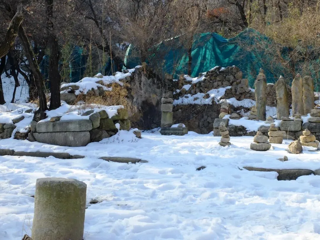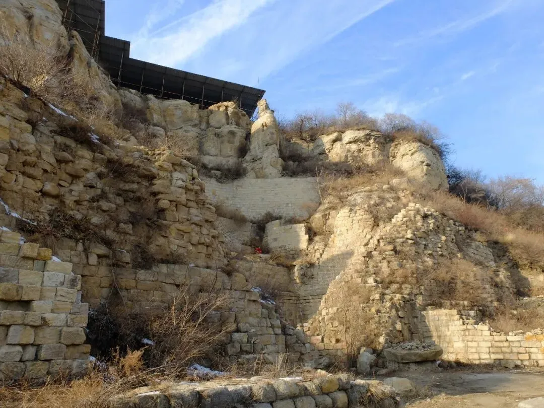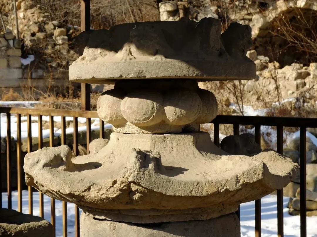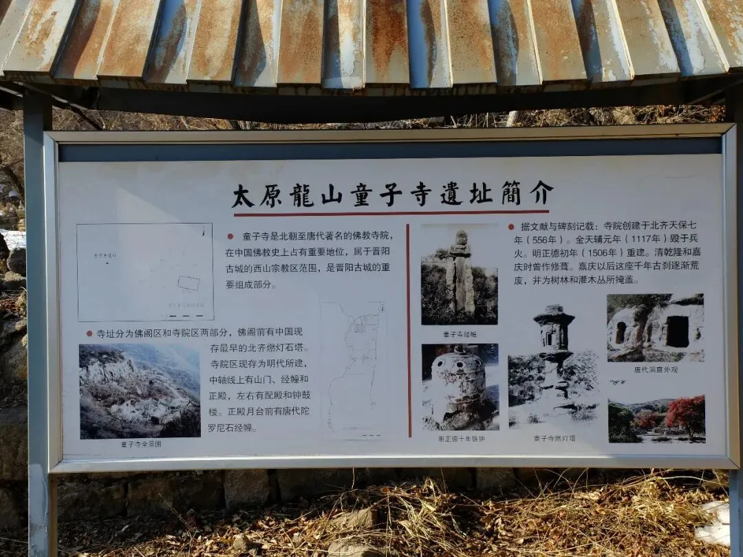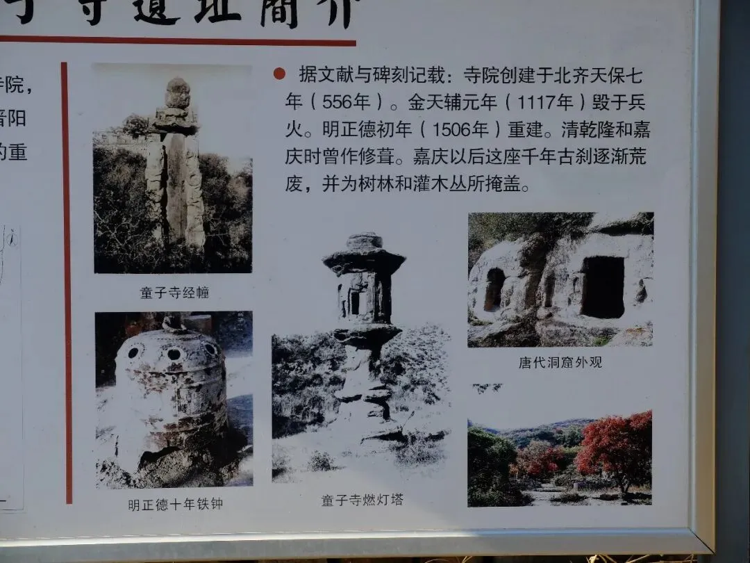 分区:坐西朝东,分南北两区。北区是北齐佛阁遗址(依大佛龛而建,墙体有北齐千佛龛、唐代护墙);南区为明代重建的长方形寺院区(有山门、经幢、正殿、配殿等遗迹)。摩崖大佛与石窟:寺西有石窟,主尊阿弥陀佛造像虽头部已失,但体量巨大;千佛龛等保留北齐造像风格。燃灯石塔:北齐同期所建,通高 4.12 米,六角单层,是我国现存最早的燃灯石塔,极具考古价值。童子寺遗址是国内少见的摩崖大佛 + 石窟 + 地面寺院相结合的早期山地佛寺实例,对研究北朝至隋唐的佛教建筑、造像艺术有重大意义。/End/