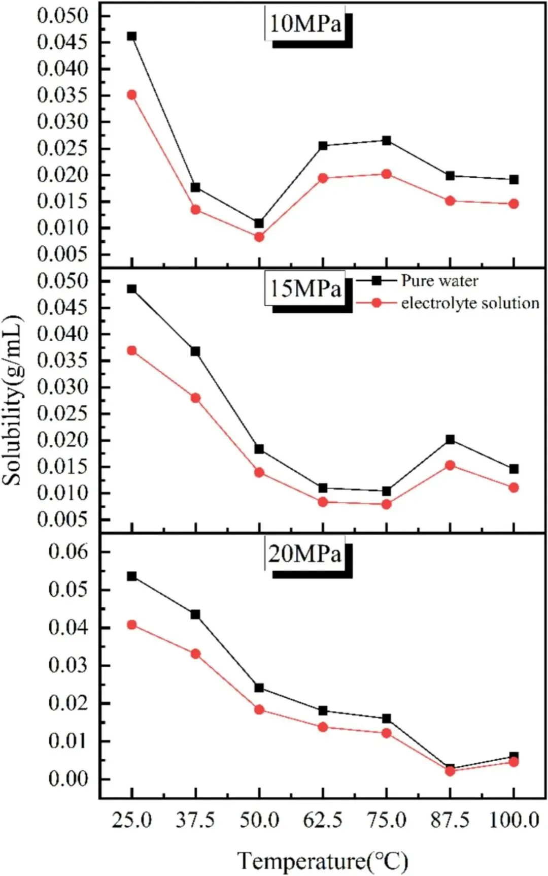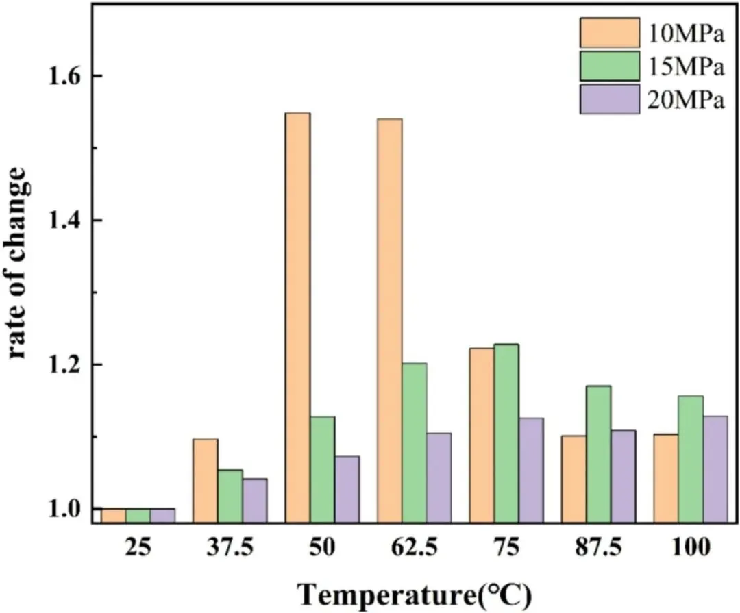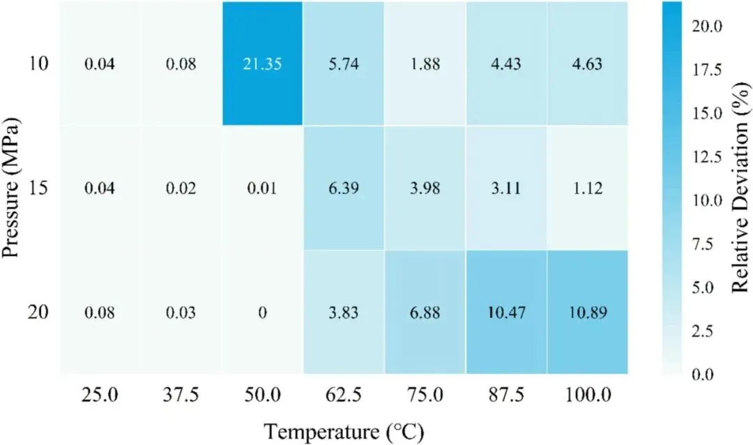 ③实验分组:设置3个压力梯度(10/15/20MPa)、7个温度梯度(25/37.5/50/62.5/75/87.5/100℃),分别测试纯 water 与模拟卤水体系中 CO₂的溶解特性