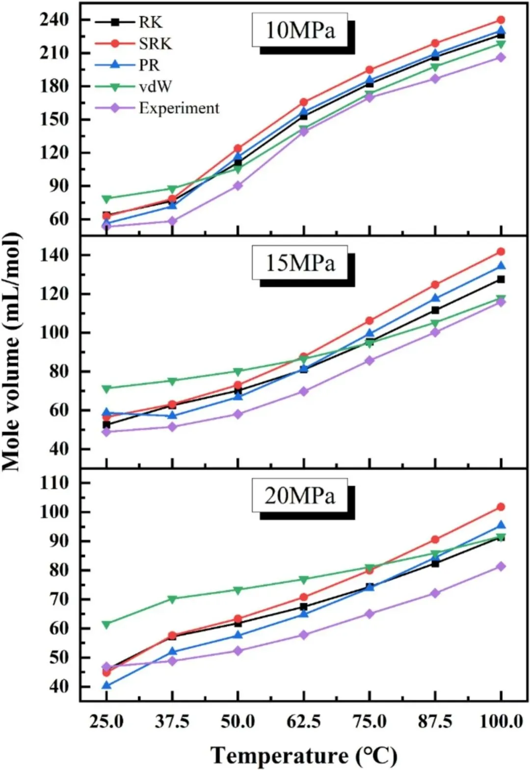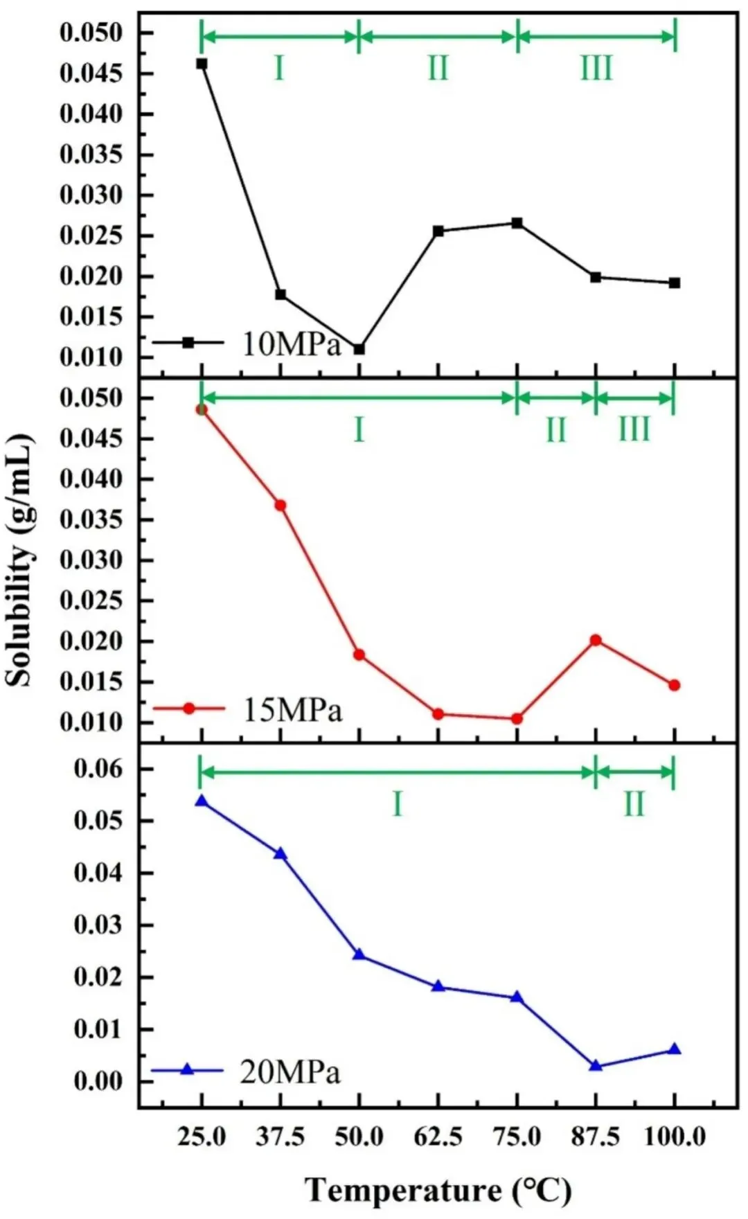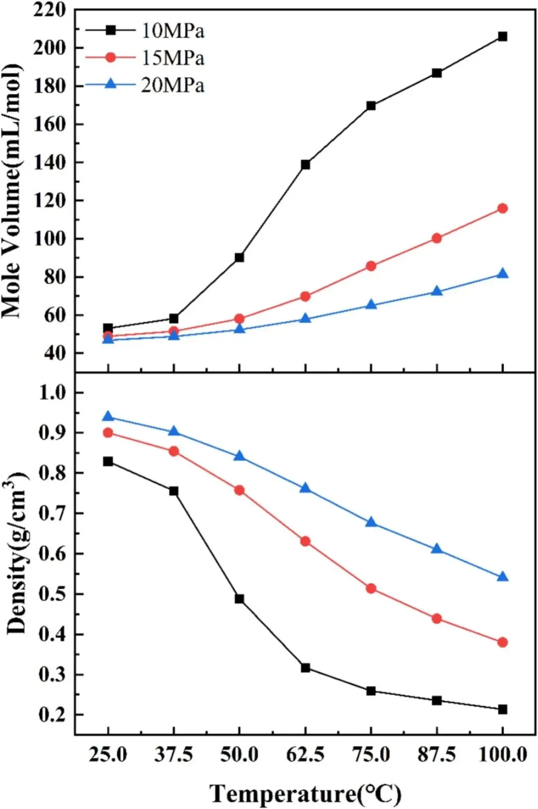 ③实验分组:设置3个压力梯度(10/15/20MPa)、7个温度梯度(25/37.5/50/62.5/75/87.5/100℃),分别测试纯 water 与模拟卤水体系中 CO₂的溶解特性