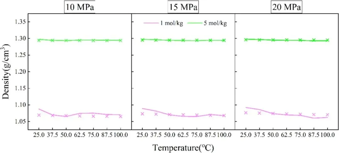 基于修正 Li-Mather 模型(连续线)和 eCPA 模型(离散点)在不同压力和盐度条件下,CO2饱和 NaCl 溶液的密度变化与温度之间的关系