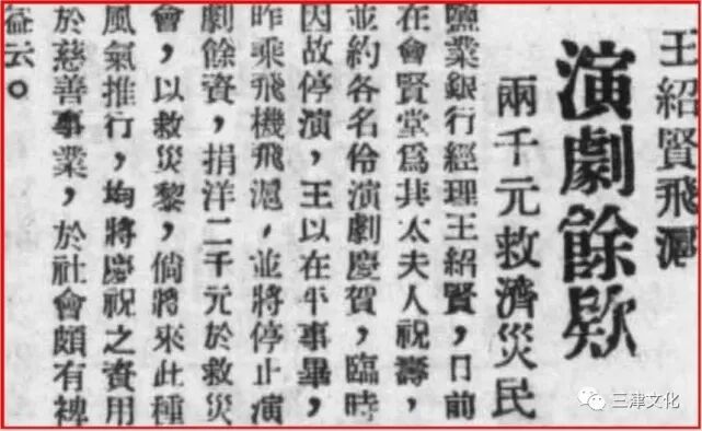 下图,《益世报(北京)》1936年9月15日报道王绍贤将其为母办寿的演出余款捐赠上海救灾会(转引自天津新闻广播《话说天津卫》节目)。