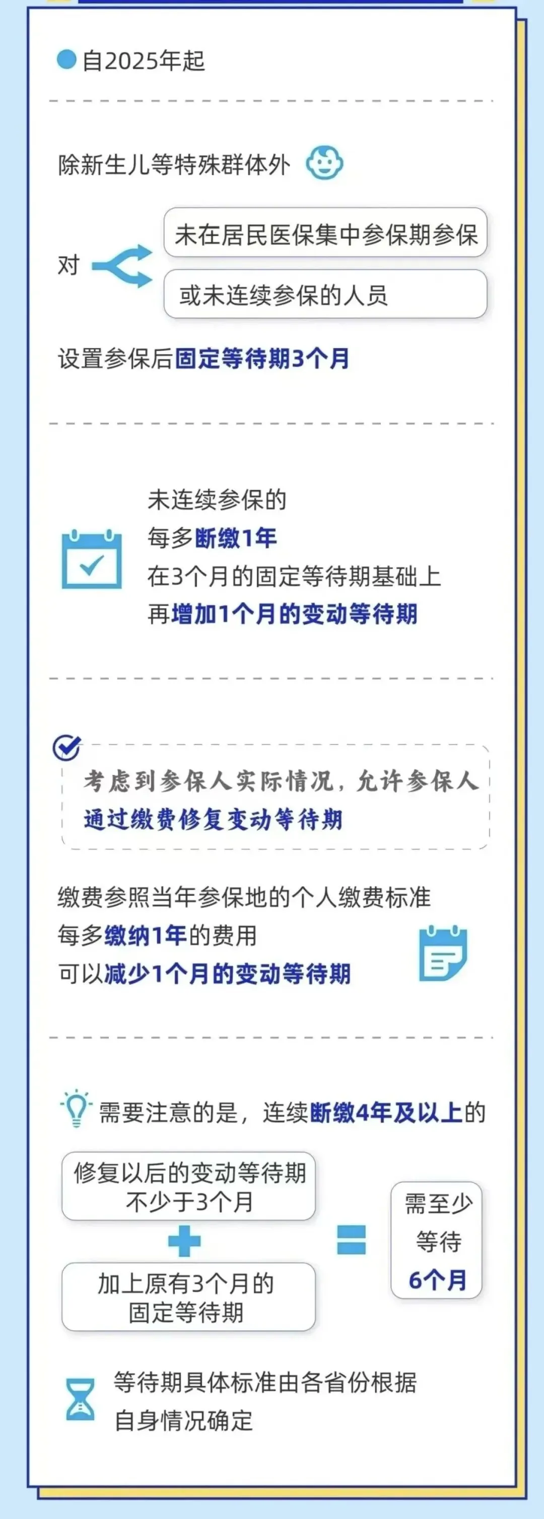 我们从两种情况来总结等待期,第一种情况是第一次办理职工医保,灵活就业医保或者居民医保。