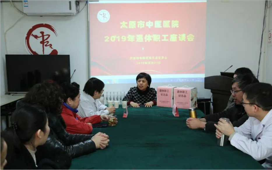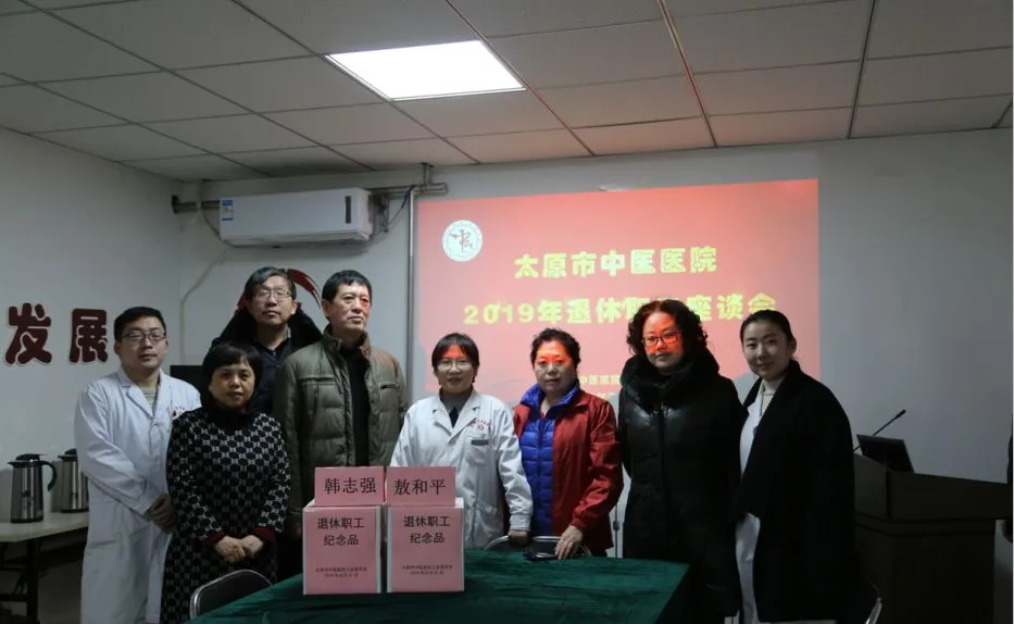 在新春佳节来临之际,1月31日下午,太原市中医医院组织召开退休职工座谈会,热烈欢送财务科敖和平、药剂科韩志强两位同志光荣退休。院工会主席王岚、财务科、药剂科部分人员参加了此次座谈,大家与退休职工欢聚一堂,送上诚挚的新春祝福。