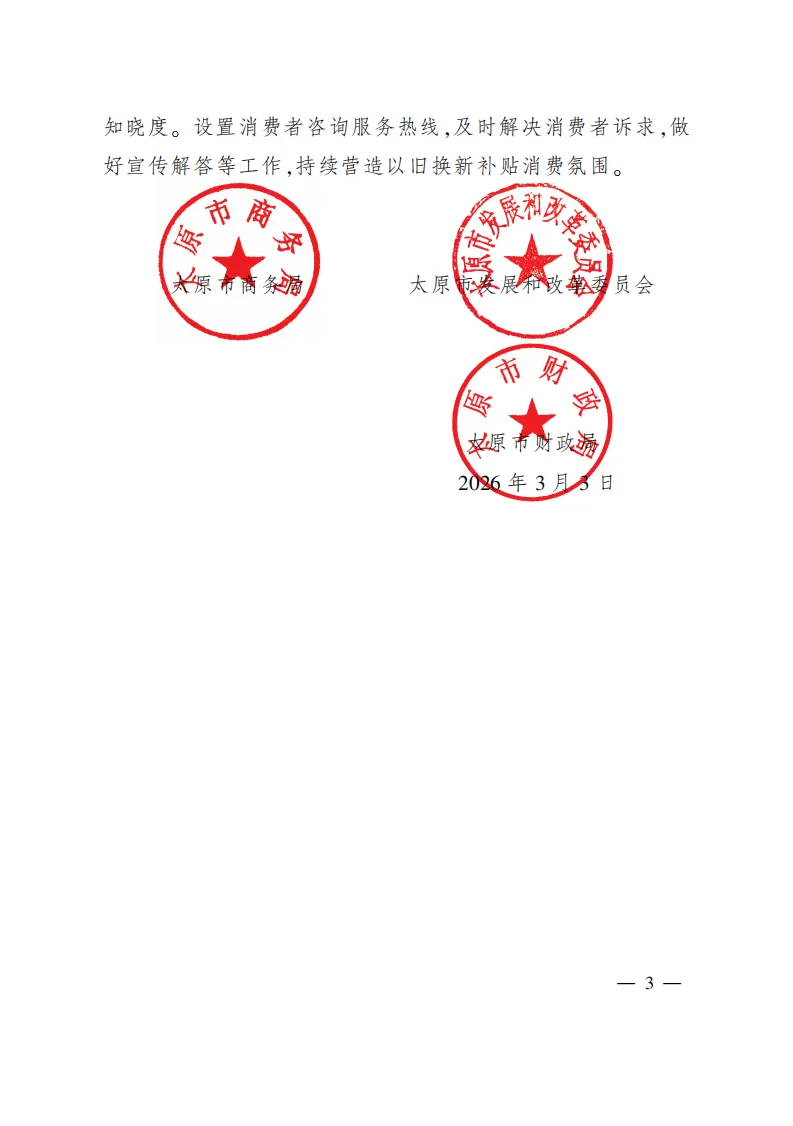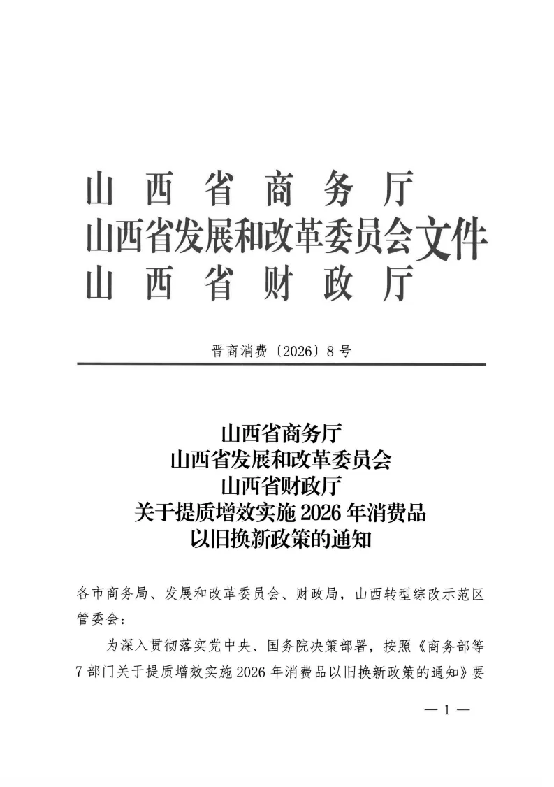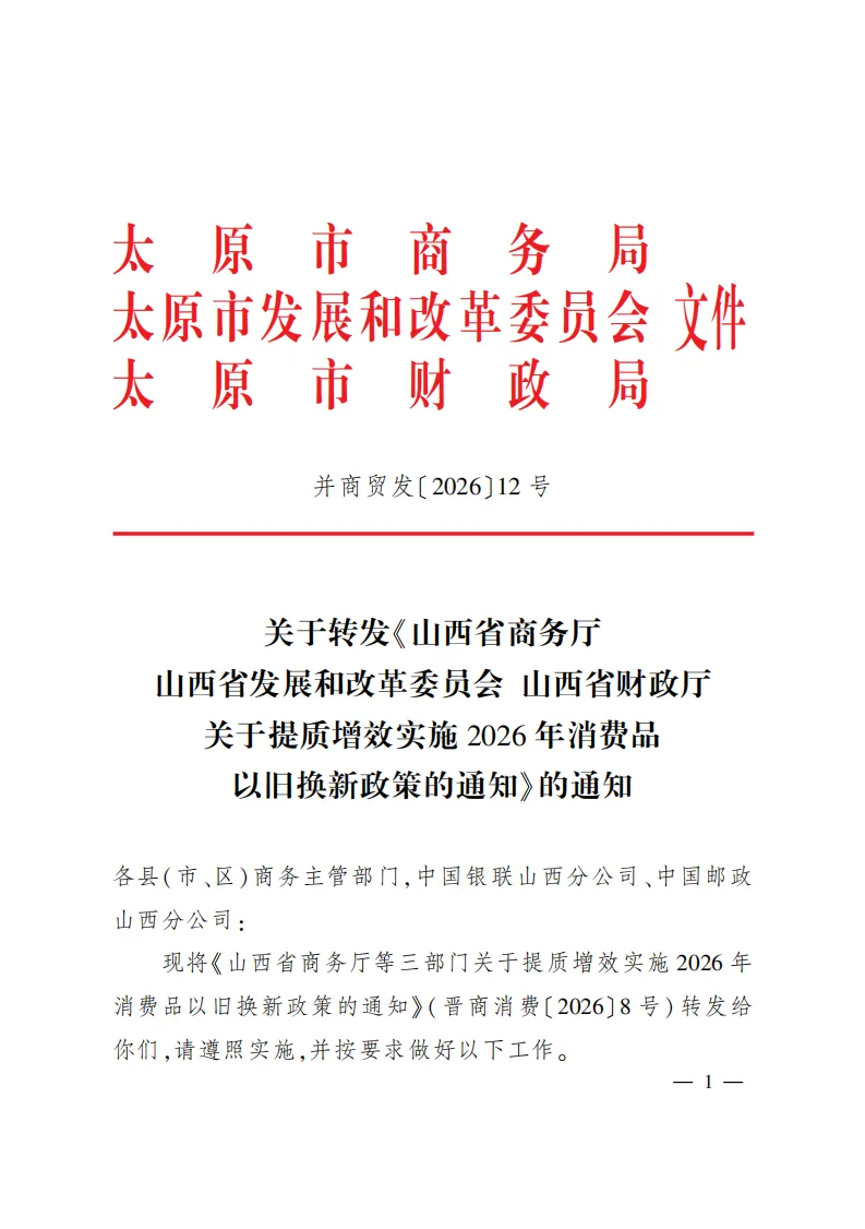 【太原市】关于转发《山西省商务厅 山西省发展和改革委员会 山西省财政厅 关于提质增效实施2026年消费品以旧换新政策的通知》的通知
