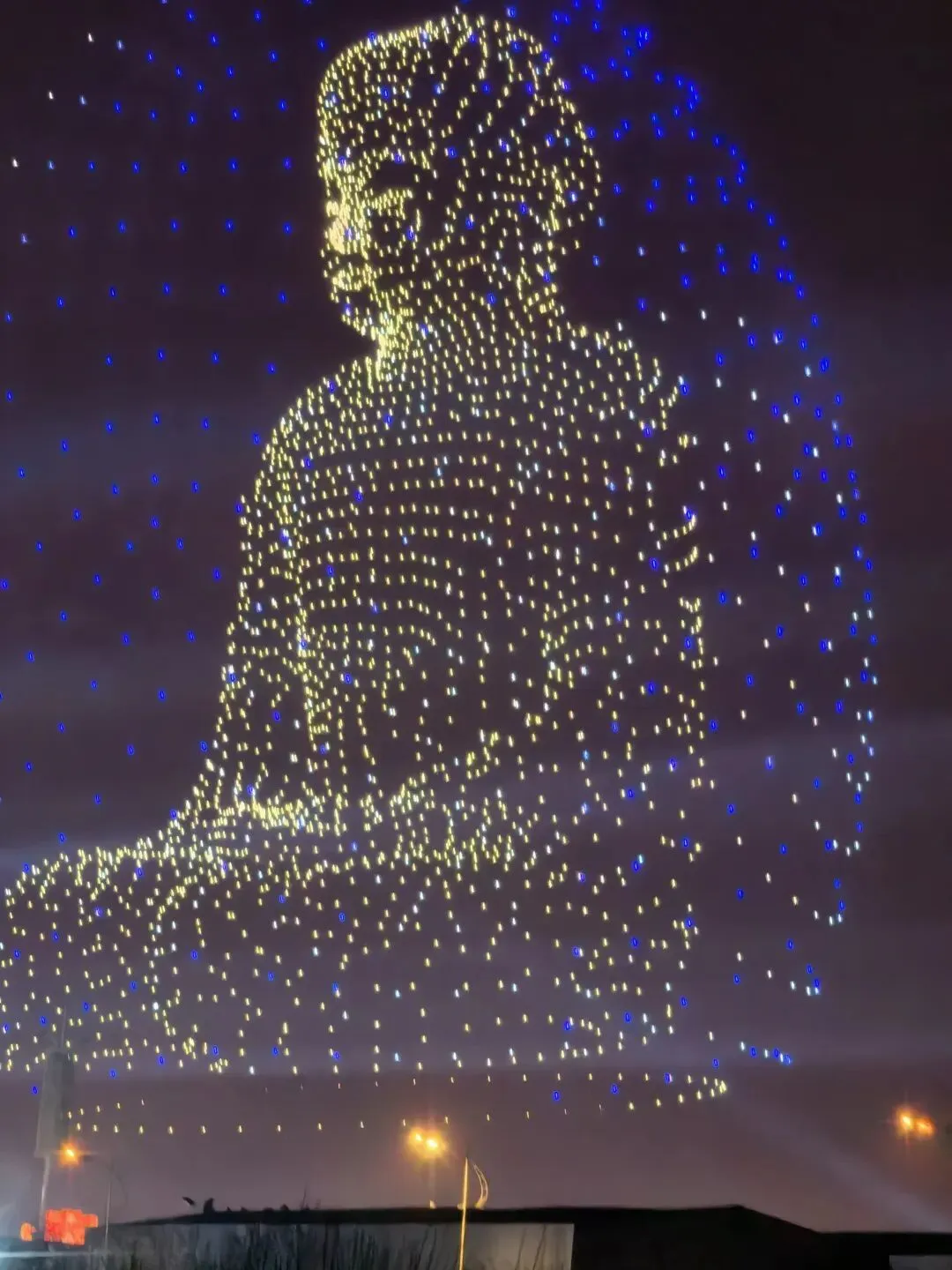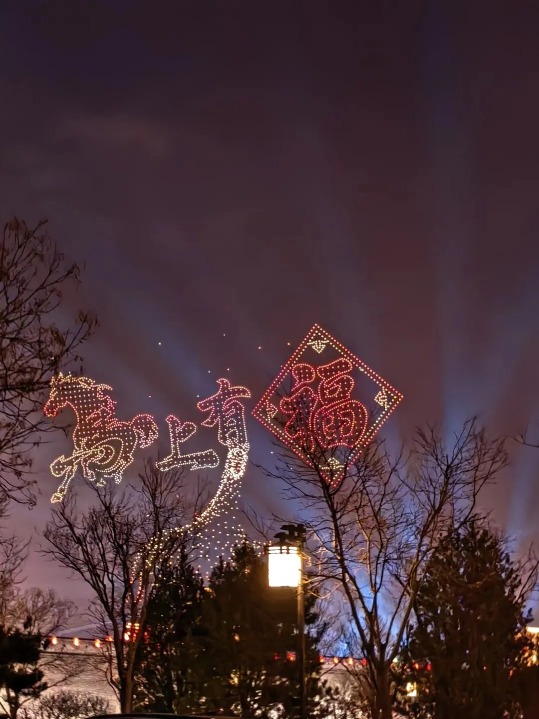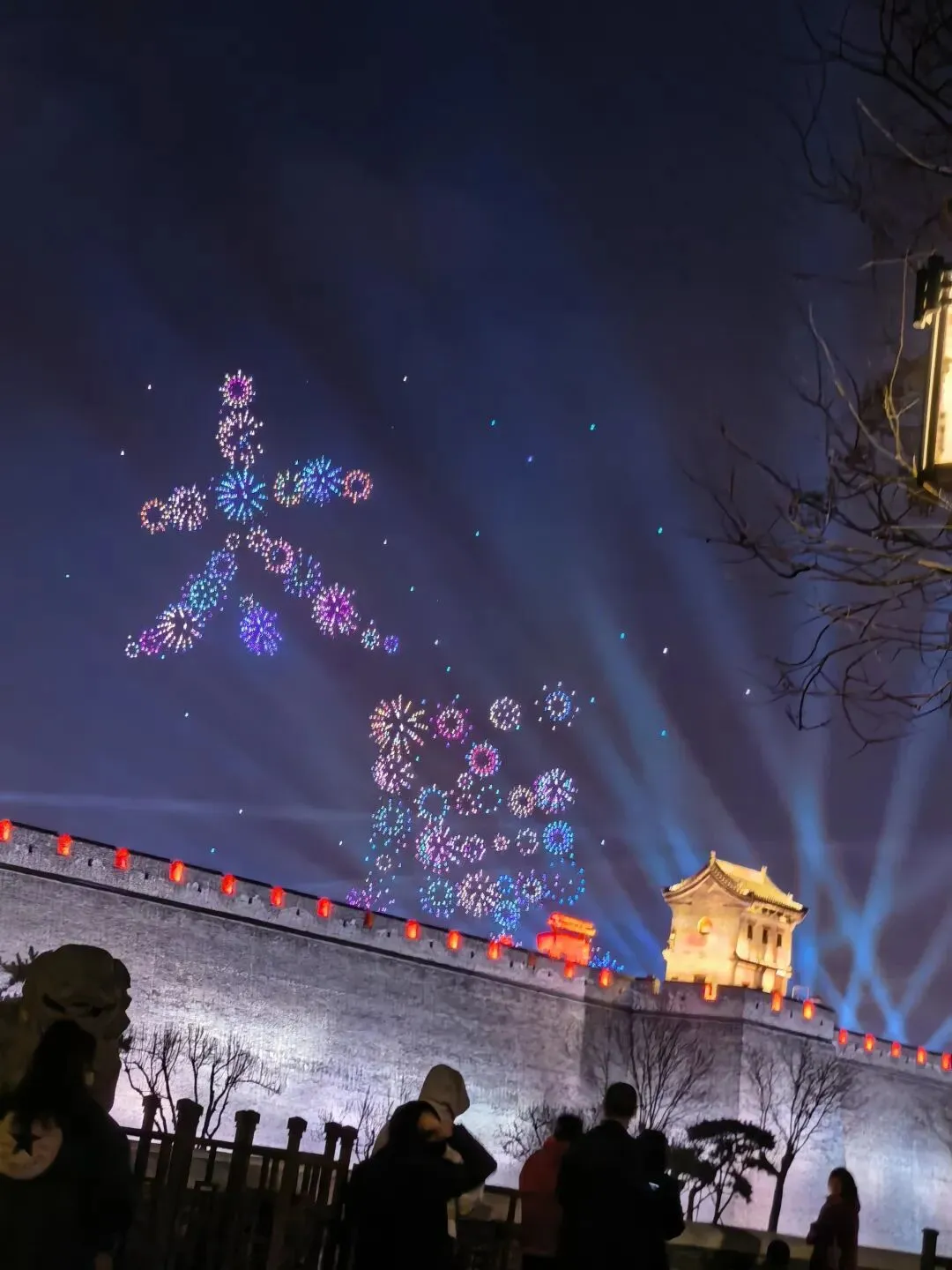 跟着人流,当我们走到古县城墙外的时候,晚七点的无人机表演已经开始了几分钟,我安慰大家说,在外面看正好,不用使劲抬头看,不累🤣
