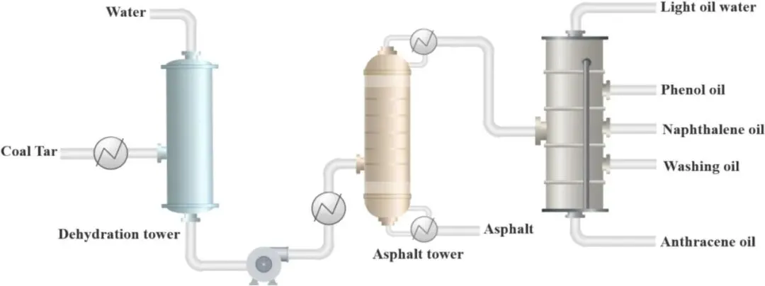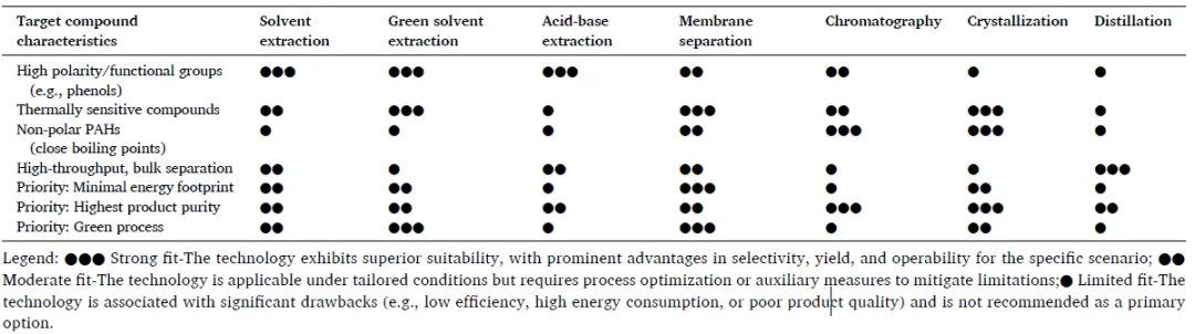 展望未来,将基本原则转化为可行的技术需要一个有针对性的研究计划,该计划要直接应对该领域最紧迫的挑战。未来的工作应战略性地集中于以下途径,每条途径都旨在克服一个关键瓶颈:1)通过分子识别实现多环芳烃异构体的精确分离。在净化类似的多环芳烃化合物时,核心障碍在于它们之间的极高的相似性。要超越一般的溶解性,就需要利用精细的分子差异。一个具体的研究途径包括使用诸如密度泛函理论和分子动力学等计算化学方法来研究不同异构体。然后,这一分子蓝图应指导合理设计能够实现选择性碳氢键-π、边-面或偶极稳定相互作用的溶剂、固体吸附剂或超分子载体。通过综合高通量实验和多尺度建模来验证这些设计将是至关重要的。在此取得成功对于生产用于先进材料和化学品的高纯度、单一组分的多环芳烃流至关重要。2)设计可逆且稳定的溶剂系统。分散萃取系统的实际应用受到回收困难和潜在不稳定性的阻碍。一个关键的研究方向是设计可循环且稳定的溶剂配方。这包括制造可逆的分散萃取系统,例如通过具有响应性刺激成分的体系,在萃取后实现清洁的相分离。同时,必须对分散萃取系统在像煤焦油这样的复杂、反应性基质中的化学和热稳定性进行系统评估,以确定持久的氢键网络。最终目标是开发集成的再生过程,以最大限度地减少溶剂损失和能源输入,确保经济性和环境可持续性。3)开发抗污垢、集成的分离平台。膜过程会受到大量有害成分快速堵塞的影响。未来的创新必须着眼于下一代膜材料及其智能集成。这需要开发具有固有抗堵塞特性的新型膜材料,通过诸如两性离子聚合物刷或光催化纳米涂层等表面改性技术来实现,这些技术能够排斥或降解有机污垢。同样重要的是,在混合工艺方案中对膜进行战略性集成。使用绿色试剂进行有效原位清洁协议的研究也将对长期运行稳定性至关重要。4)增强过程的稳健性和原料的灵活性:任何分离技术的实际应用都取决于其处理可变原料成分的能力。未来的研究必须优先开发具有适应性和弹性的分离工艺。关键策略包括设计模块化和可重新配置的分离单元,这些单元能够根据实时原料特性调整操作参数。膜过程会受到大量有害成分快速堵塞的影响。未来的创新必须着眼于下一代膜材料及其智能集成。这需要开发具有固有抗堵塞特性的新型膜材料,通过诸如两性离子聚合物刷或光催化纳米涂层等表面改性技术来实现,这些技术能够排斥或降解有机污垢。同样重要的是,在混合工艺方案中对膜进行战略性集成。使用绿色试剂进行有效原位清洁协议的研究也将对长期运行稳定性至关重要。4)增强过程的稳健性和原料的灵活性:任何分离技术的实际应用都取决于其处理可变原料成分的能力。未来的研究必须优先开发具有适应性和弹性的分离工艺。关键策略包括设计模块化和可重新配置的分离单元,这些单元能够根据实时原料特性调整操作参数。从基于化石燃料的炼油厂向可持续化学生产方式的转变,需要采用创新方法来实现复杂原料的高效利用。煤焦油因其独特的分子多样性而是一种未得到充分利用的资源,它可以在许多高价值应用中取代石油衍生的芳香烃。通过深化我们对分离机制的理解,并开发集成的、环境友好的工艺流程,我们可以将煤焦油从工业副产品转变为特种化学品和先进材料的战略性来源。这一转变不仅将提高煤化工产业的经济竞争力,还将通过资源效率和减少废弃物来为全球可持续发展目标做出重大贡献。