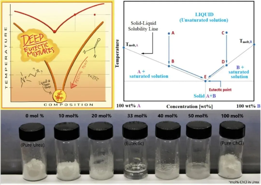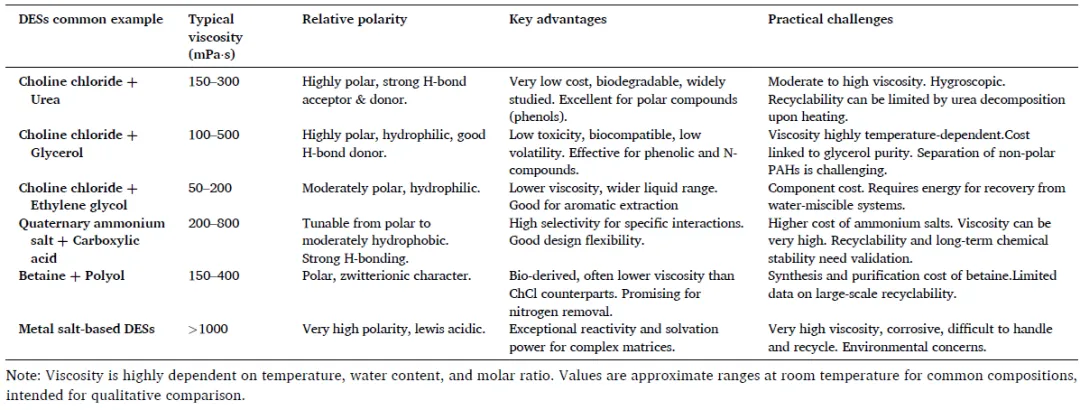 虽然传统的溶剂萃取为煤焦油的分离提供了一个通用的平台,但其对挥发性有机化合物的依赖常常引发有关环境影响、过程安全性和可持续性的担忧。为解决这些局限性,该领域出现了专门设计的一类独特的溶剂-低共晶溶剂(DESs)。这些溶剂以其可调的物理化学性质、生物相容性和通常的绿色特性而著称,代表了向更智能和可持续的分离介质的转变。因此,接下来的部分将专门探讨DESs在煤焦油增值利用中的应用,特别关注其独特的氢键网络和结构灵活性如何用于选择性提取酚类化合物、含氮杂环化合物和芳香烃。这一讨论不仅将突出DESs的实用优势,还将阐明支撑其针对性分离性能的分子层面的相互作用。DESs 是由两种或多种成分组成的稳定混合物,其稳定性主要源于组成分子之间的氢键和范德华相互作用。这会导致形成一种低熔点的共晶混合物,如图8所示。相比之下,离子液体的稳定性是由阳离子和阴离子之间的静电相互作用驱动的,其合成涉及形成离子盐。与离子液体相比,DESs具有若干优势,包括更简单、更环保的合成过程以及更低的生产成本,使其更适合大规模工业应用。制备DESs的常见方法包括加热搅拌法、旋转蒸发法和冷冻干燥法,其中加热搅拌法因其简单性和可扩展性而特别受到青睐。DESs的结构由氢键供体和氢键受体的结合构成,这一特性赋予DESs一系列有利的特性,如高溶解度、低挥发性和出色的热稳定性。这些特性使得定向萃取系统在绿色化学和可持续工业流程中具有极高的应用价值。随着全球对环保且高效的溶剂需求的不断增长,定向萃取系统的研究和应用潜力受到了广泛关注,尤其是在可持续分离工艺的背景下。由于其简单的合成方式和可调的特性,DESs在各种分离过程中可作为离子液体的有力替代品。本节对使用DESs进行杂原子化合物(如含氧、氮和硫的物质以及芳香烃)分离的当前进展进行了深入综述。这些研究展示了DESs作为优化分离过程的多功能且可持续的溶剂的巨大潜力,为提高煤焦油净化及其他工业应用的效率和成本效益提供了新的途径。