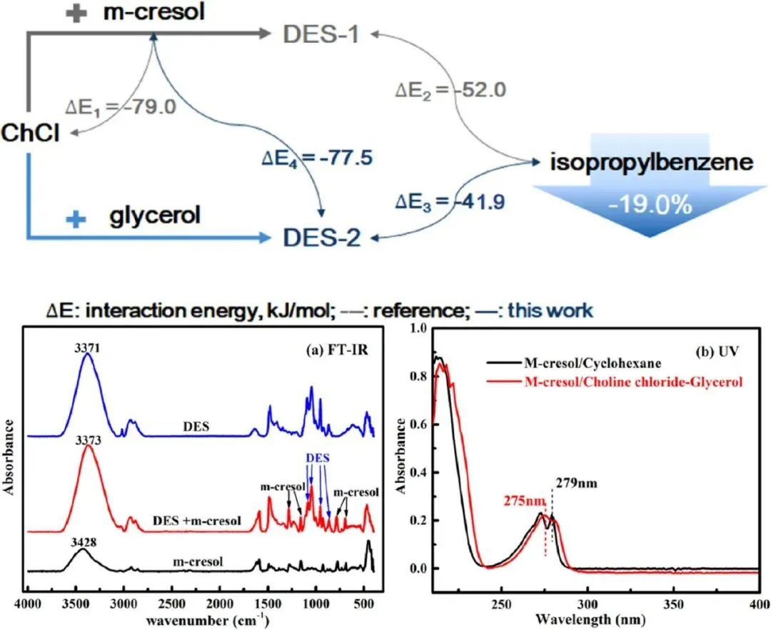 酚类化合物具有能够形成氢键的羟基,因此在利用分散萃取技术进行分离的领域中发挥着关键作用。酚类化合物凭借其通过氢键相互作用的固有能力,特别适合与分散萃取技术配合进行高效分离过程,从而在这一领域产生了大量的研究工作。Pang等是最早将DESs应用于从煤衍生液体油中选择性提取酚类化合物的科学家之一。该团队通过利用氯化胆碱与酚类化合物之间的氢键作用来合成DESs,实现了超过 90%的酚类物质去除率。这一突破之后,又进行了进一步的研究,该团队评估了由不同季铵盐、羧酸盐、磺酸盐和生物衍生试剂组成的各种DESs。所有这些DESs都表现出持续的高酚类物质提取效率,超过90%。Gu等研究了氯化胆碱-乙二醇组成的DESs,用于从模型油中提取酚类化合物,成功地将酚类和甲酚的浓度分别降低至0.025μg L⁻1和 0.05μg L⁻1。在另一项研究中,María等采用响应面方法评估了各种DESs对天然产物中酚类化合物的分离效率。他们的优化结果显示,乳酸- d-葡萄糖的组合是适用于此应用的最有效的DESs。Yi等进一步研究了胆碱氯化物-甘油基DESs与酚类化合物之间的氢键相互作用,成功地从煤液化油和煤焦油中分离出了酚类化合物,并显著减少了中性油的残留。分离机制如图9所示。这项工作不仅定性地研究了DESs与酚类化合物之间的分子间相互作用,而且还定量地证明了与DESs形成的相互作用要强得多。