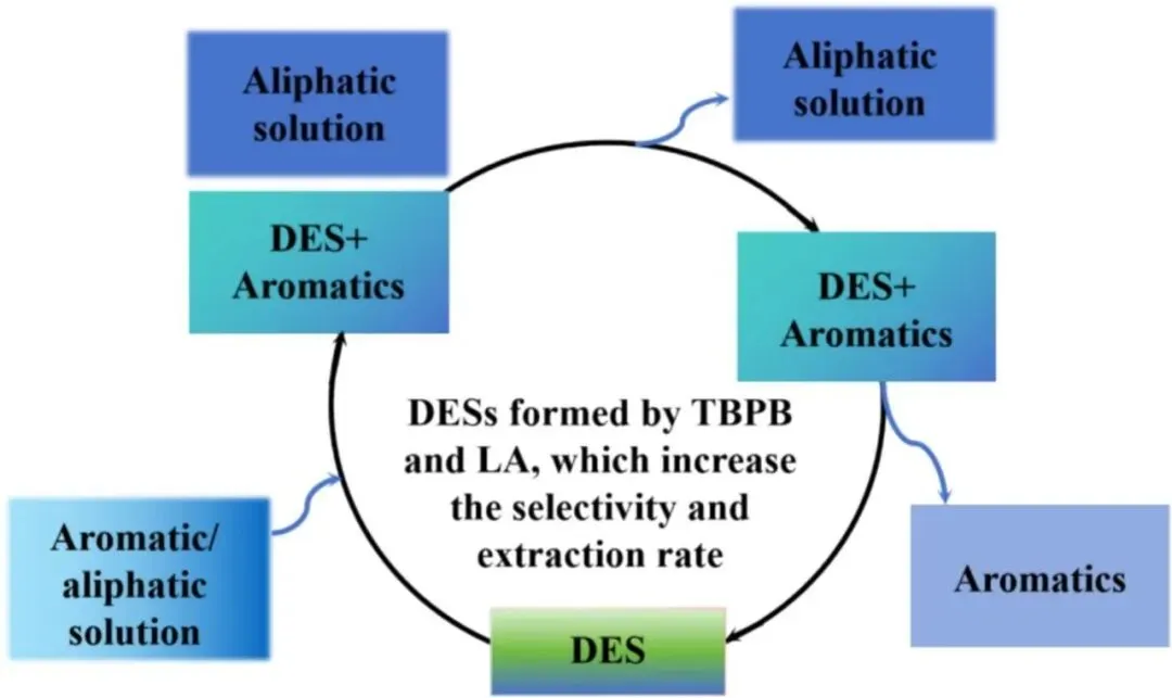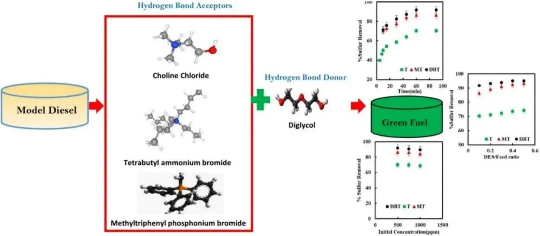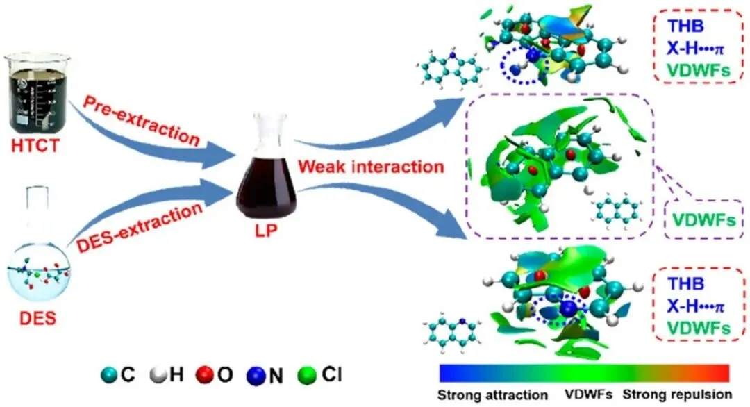 图 9. 醛类化合物分离过程机制示意图(定性分析:傅里叶变换红外光谱法、紫外-可见光谱法;定量分析:相互作用能量).这些研究突显了DESs在选择性分离酚类化合物方面日益成熟的性能。DESs能够以极低的副作用高效提取酚类物质,同时兼具环保和经济实惠的特点,使其成为传统溶剂的有前景的替代品。该领域的持续研究不断优化DESs与酚类化合物之间的相互作用,进一步提高了这些溶剂在各种工业和环境应用中的有效性和适用性。DESs在从燃料油中选择性提取和分离含氮化合物方面的应用已引起广泛关注,这得益于其环保特性以及极高的分离效率。Hizaddin等首次使用COSMO-RS模型对 94 种不同的DESs库进行了筛选,以从柴油燃料中去除氮。他们的研究涵盖了多种含氮化合物,如吡咯、吲哚、咔唑和喹啉等,并表明以铵盐和膦盐为基础的DESs(能够形成强氢键)具有出色的氮去除能力。此外,研究团队评估了DESs的经济可行性和工业可扩展性,为它们在实际应用中的潜力提供了重要见解。Ali等合成了八种不同的DESs,并评估了它们在燃料油中氮去除方面的性能。在所测试的DESs中,胆碱氯化物-苯乙酸组合表现出最有效的氮去除效果,对于吡啶和咔唑等化合物的去除效率超过95%。Kučan等开发了三种基于甜菜碱的DESs,并发现甜菜碱-丙二醇的DESs对吡啶的萃取效率最高,这是因为其粘度低且传质阻力减小,这有利于溶质的有效萃取。同年,他们的研究结果表明,水分子的加入显著提高了氮的去除效率,这可能是由于DESs的结构变得松散,从而促进了溶剂腔的形成并改善了萃取性能。Zhu等比较了聚乙二醇二羧酸和聚乙二醇二羧酸/三乙胺氯化物DESs在从石脑油中萃取含氮化合物方面的氮去除效率。他们发现,加入三乙胺氯化物有效地降低了聚乙二醇二羧酸的分子间相互作用,增强了其极性,并显著提高了氮的去除性能。虽然大多数研究都集中在从汽油和柴油中去除氮化合物上,但利用DESs从煤焦油中提取氮化合物的应用仍处于起步阶段。 Yan等探索了使用氯化胆碱/苹果酸基DESs从高温煤焦油中分离含氮化合物的方法。他们的研究得到了密度泛函理论计算的补充,研究了DESs与氮化合物之间的相互作用,为基于DESs的煤焦油分离机制提供了有价值的理论见解。图10示意性地展示了从高温煤焦油中分离氮杂环化合物的分离机制,其中DESs通过特定的非共价相互作用实现选择性提取,包括典型的氢键、X-H...π 接触和范德华力。尽管从较简单的燃料基质中提取含氮化合物的发现具有一定的前景,但煤焦油系统的复杂性给DESs的应用带来了巨大的挑战。因此,需要进一步研究以优化基于DESs的脱氮煤焦油提取技术。然而,DESs作为可持续溶剂的持续发展,为推进更高效和环保的分离过程带来了巨大希望,特别是对于像煤焦油这样的复杂工业原料而言。在这一领域的持续研究对于扩大DESs在大规模工业应用中的作用至关重要。图 10. 深度共晶溶剂与咔唑、喹啉[82]之间的相互作用(HTCT=高温煤焦油;LP=轻质部分;VDWs=范德华力;THB=典型氢键).由于DESs具有环保可持续性和高效的分离能力等优点,因此其在从燃料油中去除含硫化合物方面的应用受到了越来越多的关注。Li等首次对16种不同的DESs用于从燃料油中去除硫化合物进行了全面研究。他们的研究中,氢键受体包括氯化胆碱、氯化四甲基铵和氯化四丁基铵,而氢键供体包括苹果酸、甘油、四甘醇、乙二醇、聚乙二醇和丙酸酯。他们的比较分析表明,含有四丁基铵的DESs与硫化合物的氢键结合能力最强,从而具有更出色的脱硫效率。Tang等合成了苯甲烷基的DESs,并展示了其去除噻吩型硫化合物的显著能力。引入苯环结构增强了π-π相互作用,进一步提高了脱硫性能。为了进一步提高离子液体和双功能萃取剂的脱硫效率,Jiang等开发了一类新型的基于离子液体的DESs,其中离子液体充当氢键受体。这些新型的DESs的脱硫效率优于传统的离子液体,尽管其制备过程由于各成分的溶解度差异而更为复杂。同样地,Lima等使用了四种不同类型的DESs来同时提取氮和硫化合物。他们观察到,硫的去除效率受氮化合物的存在影响,这表明双重去除策略可以得到优化,以实现更好的整体分离性能。Jha等证实了四丁基卤化铵基DESs的脱硫效果,并对液-液平衡条件进行了热力学研究。DESs作为绿色脱硫剂,通过将氢键受体(包括氯化胆碱(ChCl)、四丁基溴化铵(TBAB)和甲基三苯基膦溴化物(MTPPhBr))与给体(如二甘醇)结合而发挥作用。TBAB/二甘醇配方的效率最高,其次是MTPPhBr/二甘醇和 ChCl/二甘醇。初始硫化合物(二苯并噻吩、噻吩和苯并噻吩)的浓度与其去除率之间存在明显的相关性,这表明DES在燃料净化中的实际应用潜力,如图11所示。他们的研究为DES在脱硫过程中的相行为提供了有价值的见解。此外,Warrag等研究了三元DES系统的相图,进一步阐明了不同DES类型的提取能力。图 11. 采用深度共晶溶剂分离含硫化合物的原理图(T代表噻吩;MT代表苯并噻吩;DBT代表二苯并噻吩).此外,一些研究已成功地将DESs应用于硫化氢的去除,其效果在效率方面表现出了令人鼓舞的成果。然而,尽管取得了这些进展,利用DESs从煤焦油中分离含硫化合物的研究仍相对有限。鉴于煤焦油及其富含硫的成分的复杂性,还需要进一步的研究来探索和优化基于DESs的煤焦油脱硫方法。总之,尽管DESs在从汽油和柴油等燃料中去除硫方面已展现出