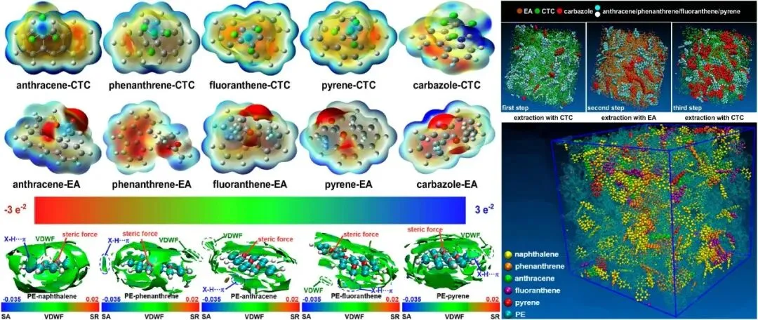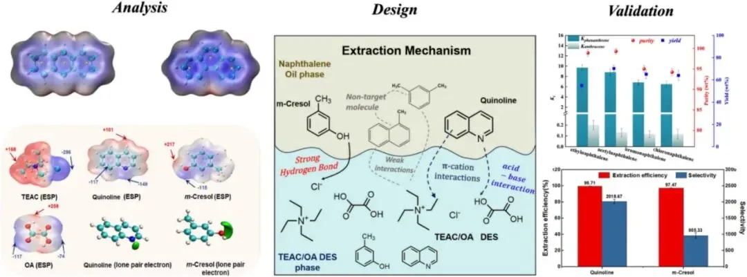 从本质上讲,溶剂萃取是一种复杂的分离方法,其基础在于对微弱分子间作用力的精确识别和利用。分子间的相互作用从根本上可分为两类:强相互作用,包括共价键和离子键,它们赋予了基本的结构完整性;弱相互作用,尽管其能量特征短暂且微弱,但在不同领域指导分子的组装和识别事件中却是不可或缺的。后者包括范德华力、π-π相互作用和氢键等现象,在超分子化学、晶体工程、生物系统、中支撑着结构的连贯性和功能。正是对这些微妙但普遍存在的力的精心调控,构成了先进分离科学的基石,尤其是在处理复杂分子矩阵时更是如此。先进的计算量子化学的出现对于从对这些力的定性理解过渡到定量预测的科学领域起到了关键作用。例如,密度泛函理论计算已成为精确量化相互作用能量、将静电势能表面映射出来以识别结合热点,并揭示溶剂-分析物复合物中电荷转移、极化和静电成分对整体结合能的复杂贡献的不可或缺的工具。在复杂的煤焦油环境中,存在着一个复杂的、化学性质各异的体系,其中各成分的稳定性是通过这些微弱的分子间相互作用形成的微妙平衡来维持的。因此,分离过程中的关键挑战不再仅仅是基于溶解性的考量,而是演变成了一种分子层面的相互作用能量的竞争较量。成功的提取需要一个精心策划的过程,在此过程中,溶剂必须通过形成新的、更符合热力学条件的相互作用(无论是静电作用、分散驱动作用还是定向作用)来选择性地与目标分析物结合,同时以最小的扰动来破坏原有的关联网络,而不影响非目标成分。因此,核心模式转变为竞争性溶剂化:溶剂与分析物之间的相互作用能量必须超过原始分子环境所提供的累积稳定能量,才能实现有效的分配。在此,分子动力学模拟提供了一个动态的、原子级的视角,用于可视化和量化这一竞争过程。通过模拟在候选溶剂存在的情况下复杂混合物的动态演变过程,分子动力学能够揭示结合/解离的自由能曲线,阐明溶质转移的机理,并验证所设计的溶剂是否能够有效胜过天然环境,从而在静态量子力学与宏观实验可观测结果之间建立起联系。这一方法框架上的一个关键性进展是由 Julie B. Zimmerman教授提出的。在具有影响力的综述中,他们扩展了绿色化学的常规十二项原则,并正式引入了利用弱分子间相互作用作为设计工具的必要性。这一概念框架将溶剂选择从一种经验性的操作提升为一种理性的设计策略,对像煤焦油这类复杂的原料的可持续价值化具有深远影响。通过基于分子识别和互补相互作用潜力来优先考虑分离,这一原则不仅增强了高价值成分的经济潜力,而且也符合绿色化学中减少源头和本质上更安全的化学设计的核心原则。图13中使用萘基溶剂分离蒽和菲的计算实验协同作用就是一个有力的例证。首先使用密度泛函理论计算来分析通过局域轨道定位图进行的电子离域,结果表明菲和蒽具有不同的电子中心环。这种静电差异引导了对乙酰萘的选择。随后的减小密度梯度分析和能量分解证实了主要的分子间相互作用。实验上,这意味着对蒽和菲的有选择性的提取。Yi等应用了类似的协同方法从洗油中提取吲哚。他们的研究采用了基于密度泛函理论的分析来量化和比较吲哚相对于其他芳香成分的π堆积能力。独立的梯度模型可视化和相互作用能量分解进一步表明,一种定制的深度共晶溶剂可以通过强烈的静电相互作用与吲哚结合,有效地取代油中由分散驱动的原有结合方式。基于这一计算见解,实验优化的条件实现了高效地提取吲哚。Luo等采用了一种集成的多尺度方法,使用四乙铵氯化物/草酸(TEAC/OA)体系,从模型燃料中同时提取酸性的间甲酚和碱性的喹啉。他们的研究结合了计算与实验的协同分析,以剖析其背后的协同分工机制。基于密度泛函理论的静电势图绘制和相互作用能量量化表明,DESs组分具有互补的活性位点:氯离子作为对间甲酚的强氢键受体发挥作用,而OA和TEA+阳离子则分别通过酸碱相互作用和阳离子-π相互作用与喹啉形成协同作用。基于这些见解,通过实验优化条件,获得了图13中所示的两种目标化合物的出色同时提取效率,超过97%。这些工作展示了一种闭环的多尺度策略,其中计算工具阐明了相互作用蓝图并指导溶剂设计,而实验验证则进一步完善了分子模型。图 13. 计算与实验协同作用的示意图(TEAC=四乙基氯化铵;OA=醋酸;ESP=电势).用于此类工程目的的弱相互作用的种类丰富多样,包括范德华力、π-π堆积、氢键、二氢键以及卤素键,如图14所示。从能量和机制的角度来看,这些相互作用可以分为两个主要类别:(1)主要由静电成分主导的相互作用(例如氢键、二氢键、卤素键),以及(2)主要由分散力支配的相互作用(例如范德华相互作用、π-π堆积)。对它们的全面分析揭示了每个类别所受特定因素的控制:静电相互作用的强度可以通过调节质子供体的酸性、质子受体的碱性、电负性和操作温度来进行微调;而分散相互作用则可以通过分子结构的改变(例如引入特定的取代基、改变极化率、电子云拓扑结构和分子构象)来进行调控,这些内容在其开创性研究中有所阐述。至关重要的是,他们所确定的因素并非仅仅是经验参数;它们易于获取,并且可以通过计算机模拟进行优化。密度泛函理论能够精确计算pKa值(酸性)、质子亲和能(碱性)以及分子静电势,为静电调节提