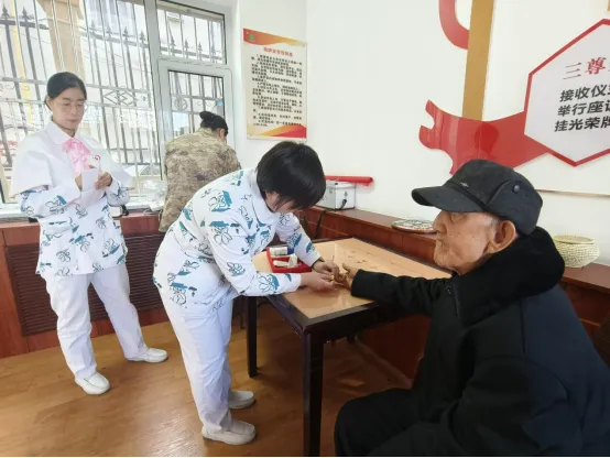 志愿护理服务队与正在棋牌室下棋的军休干部密切沟通,详细了解他们的身体状况、健康需求和精神诉求,现场为他们问诊、量血压、测血糖、并即时为他们制定了周密细致的健康日程单,叮嘱他们按照方案饮食、锻炼。