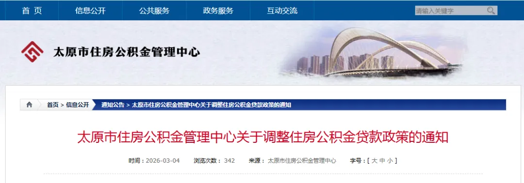 2026年3月4日,太原市住房公积金管理中心发布了关于调整住房公积金贷款政策的通知。