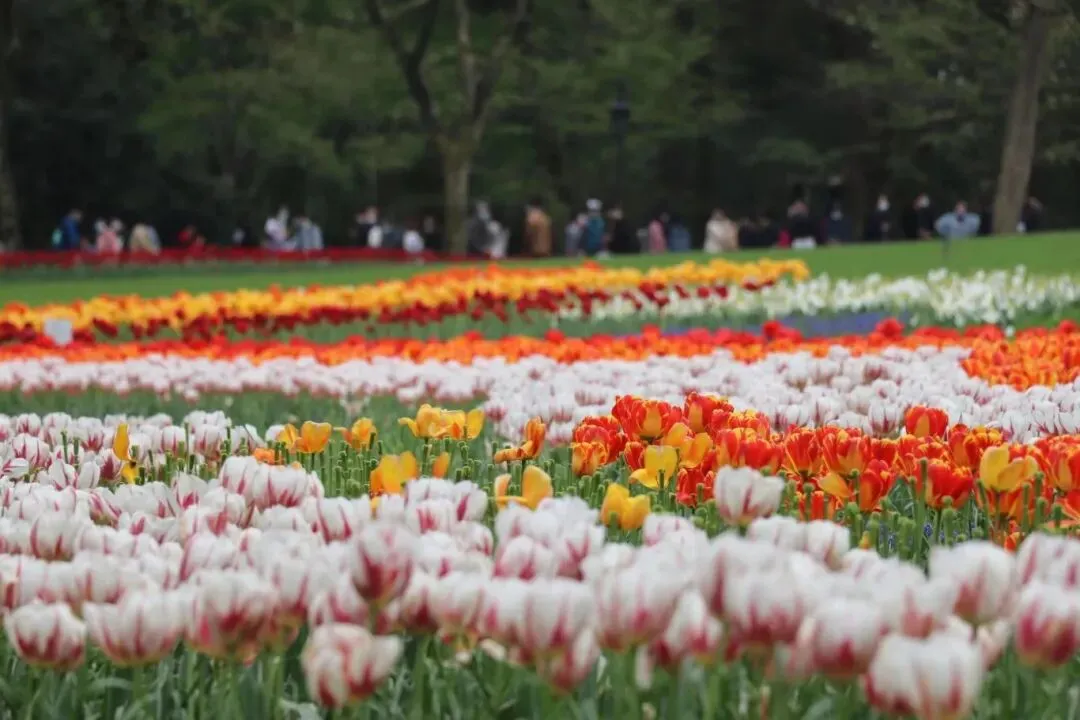 四月,郁金香以浓烈的色彩冲击视线。红的似火、黄的如金、紫的如烟,单瓣或重瓣的花朵像一只只精致的高脚杯,盛着春日的露水与阳光。这些来自荷兰的“花中皇后”,在太原的土地上绽放出别样的热情,与本土花卉形成奇妙的对话。