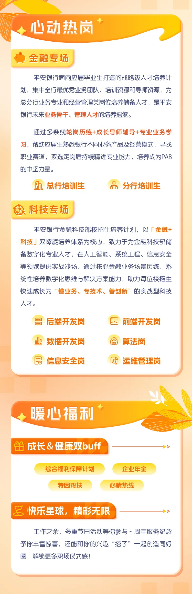 1、作为银行未来经营管理类岗位的储备人才,入职后在支行、分行中台轮岗锻炼18个月(最长),轮岗期结束或轮岗过程中培养情况双选定岗。