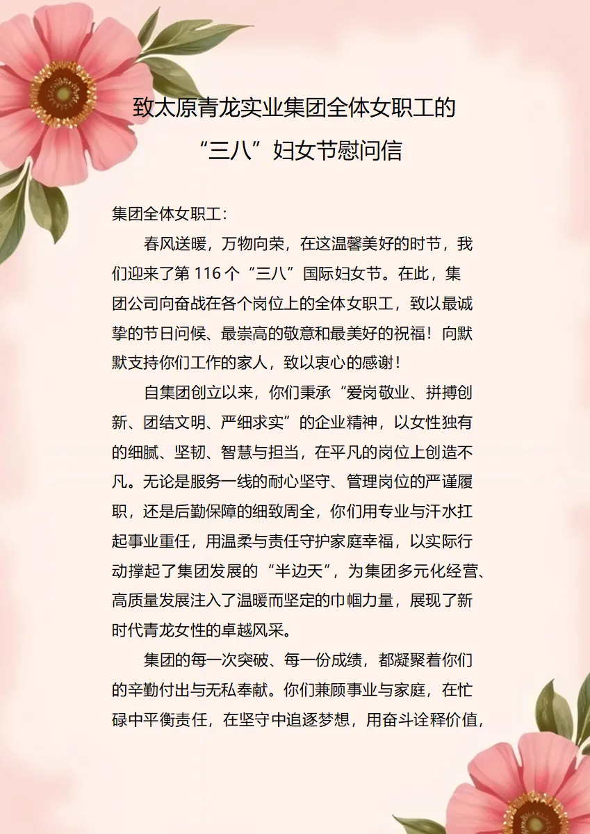 致太原青龙实业集团全体女职工的“三八”妇女节慰问信