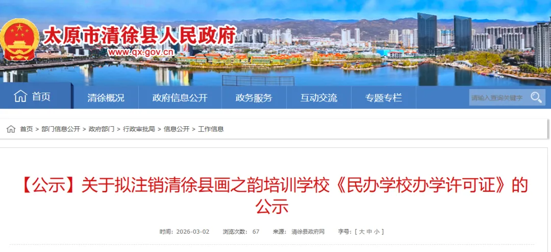 关于拟注销清徐县画之韵培训学校《民办学校办学许可证》的公示清徐县画之韵培训学校于2026年3月2日主动向我局提交了民办学校终止办学的申请。根据《中华人民共和国行政许可法》、《中华人民共和国民办教育促进法》和《中华人民共和国民办教育促进法实施条例》等相关规定,拟同意终止其办学资格并依法注销该校的《民办学校办学许可证》,现公示如下:
