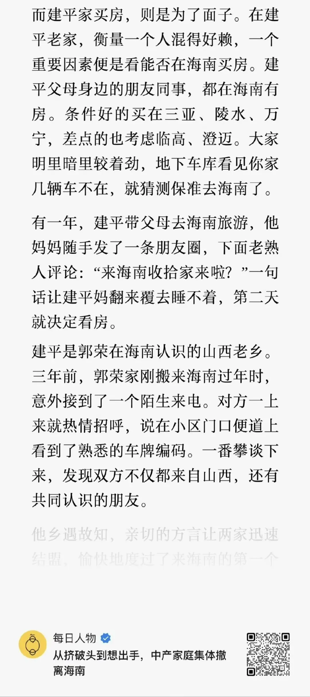 这段话呢,也是人尽皆知,因为她写尽人性两难的那个味道,我在这里生硬又觉得恰当地成为当下我们山西老乡里边的高净值人群在太原与海南之间置业选择的最佳隐喻——很多山西人心里,都藏着两套房子——一套在海南,面朝大海、四季温暖,是逃离寒冬与雾霾的远方理想;一套在太原,扎根故土、亲友相伴,是放不下的烟火与归处。一边是向往的生活,一边是刻在骨子里的乡愁,成了无数人一辈子都在纠结的买房选择题。