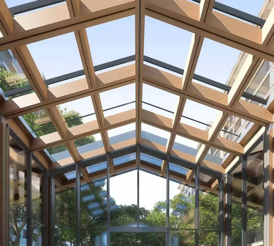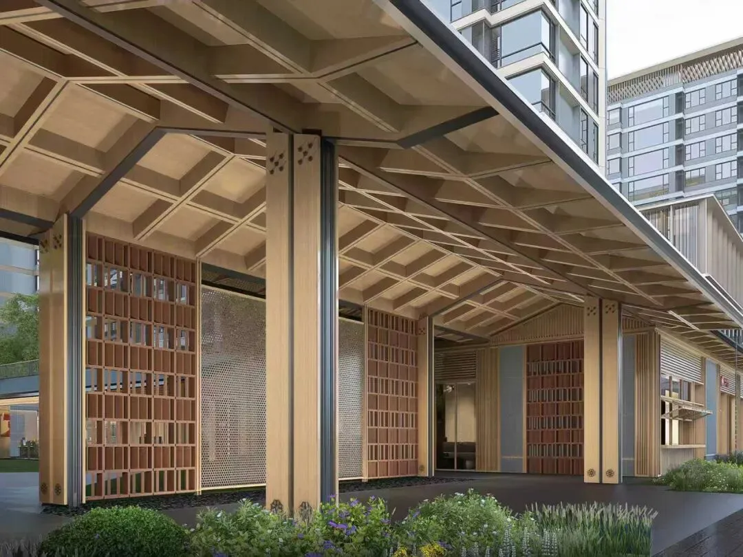 中庭是西湖隐秀连接城市和园区的重要空间,出则繁华入则宁静,中庭是两者的转换过渡空间,也是院落文化现代演绎的核心场所。我们把入户大堂退到园区内部,与入口门廊之间用健身等形成了围合院落。这里没有开门见山的宏大叙事,也没有严格对称的规整轴线,而是用中国传统园林的启承转合的手法,形成步移景异的丰富视觉体验,中庭内“四水归堂”的屋面结合轻巧的木质游廊,神似山西大院,也仿佛置身度假酒店。园区居民可以在家门口体验浓郁的文艺范的烟火气。
