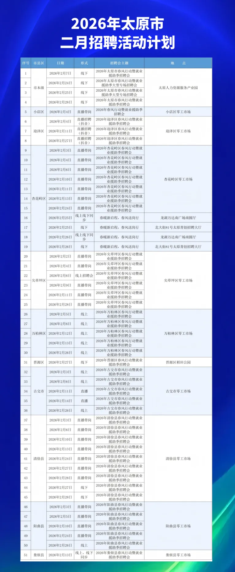 据介绍,2月份的51场专场招聘会,围绕重点群体就业需求,抢抓重点时段,通过线下大型招聘会、直播带岗、线上专场等多种形式,实现“送岗位、送政策、送服务、送温暖”全方位覆盖。腊月二十三当天,清徐县、阳曲县将举办春风行动暨就业援助季招聘会,通过直播带岗,集中强化各类重点群体就业服务,保障重点领域用工。除夕前一周,各县(市、区)将积极挖掘就业岗位、分类分级就业援助。腊月二十四,迎泽区开通抖音直播招聘,尖草坪区直播带岗。腊月二十五,万柏林区连续两天举办春风行动暨就业援助季招聘会。腊月二十六,杏花岭区、清徐县、娄烦县将“春风送岗”,促进节前稳岗、高效对接。腊月二十七,古交市举办春风行动专场招聘会。