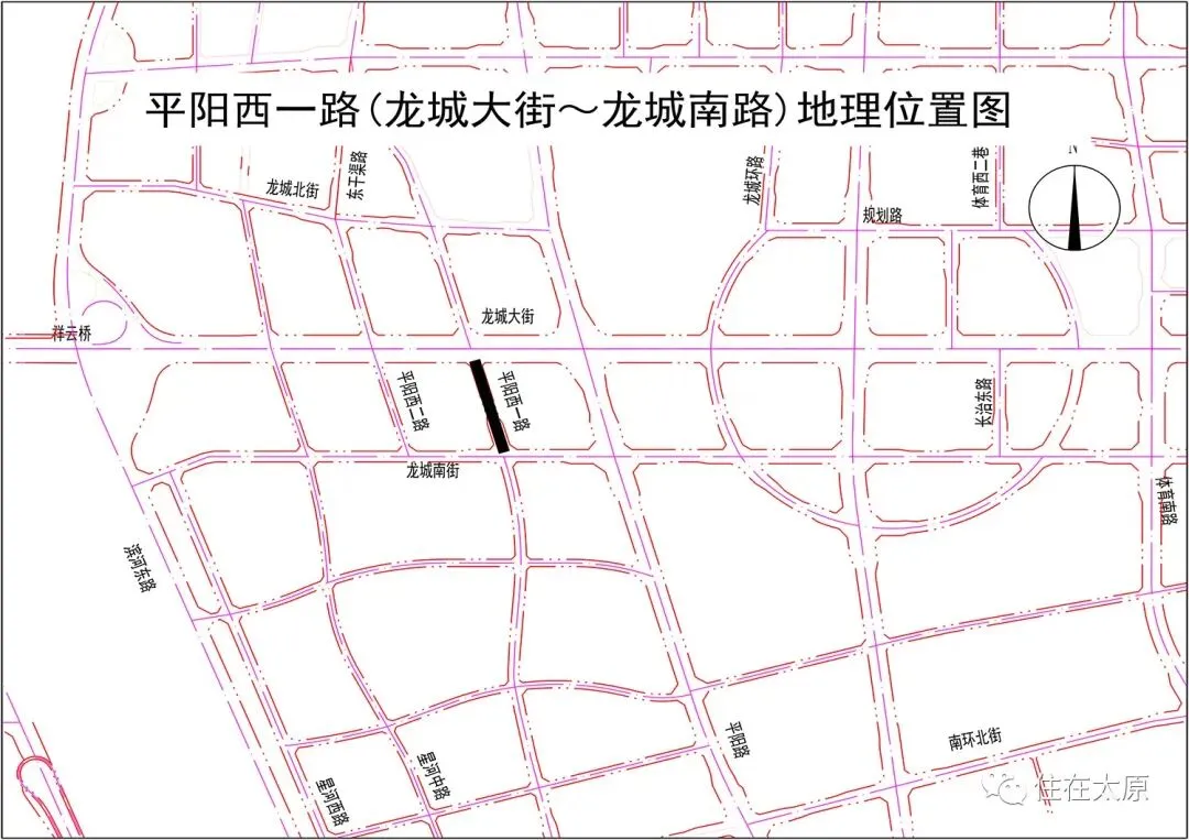 三给街西段西起汾西路、东至和平北路,全长约1082米,城市主干路。规划红线40米,中间21.5米机动车道,两侧2.25米绿化带,3.5米非机动车道,3.5米人行道(含1.5米树穴带)。