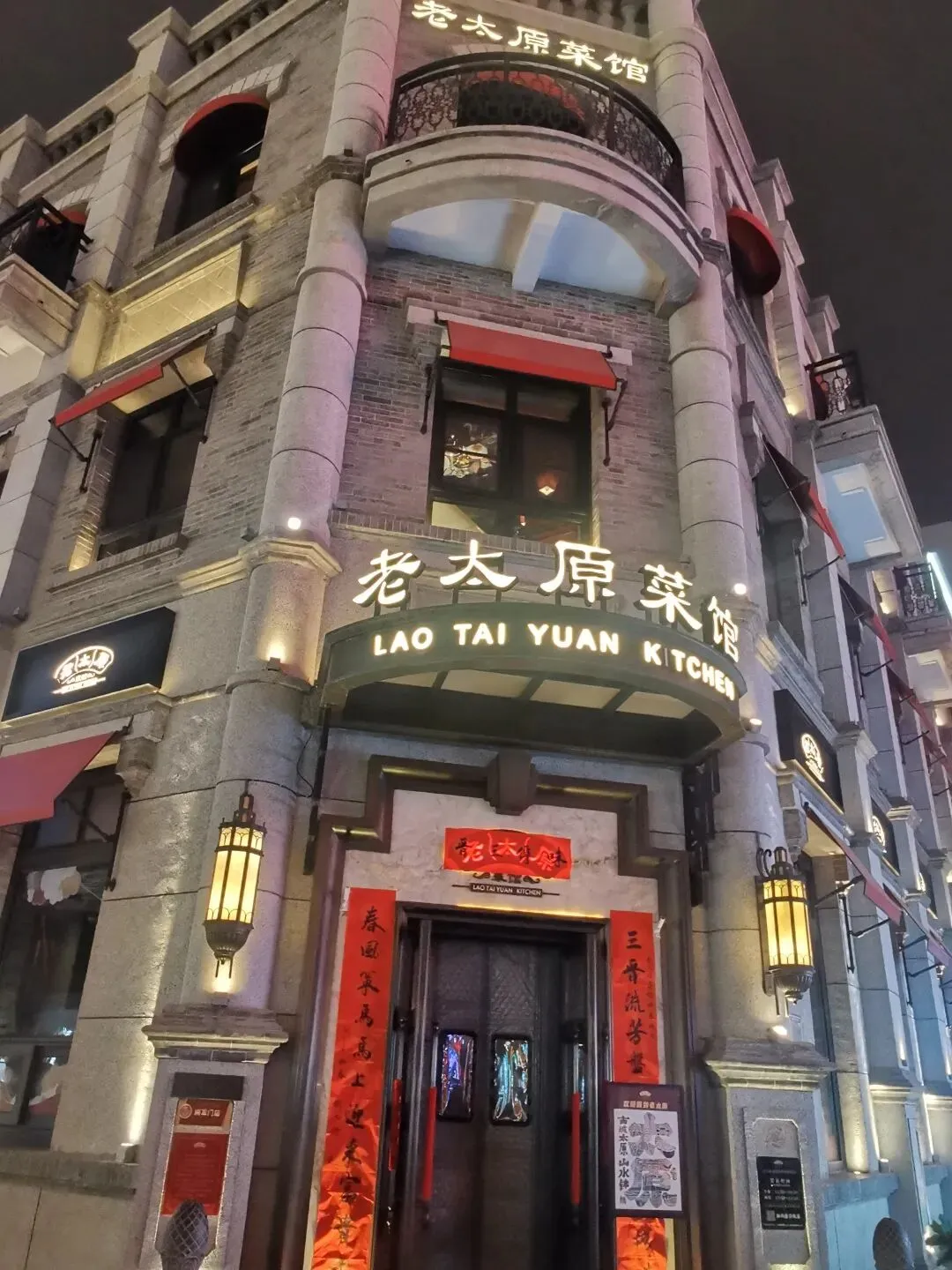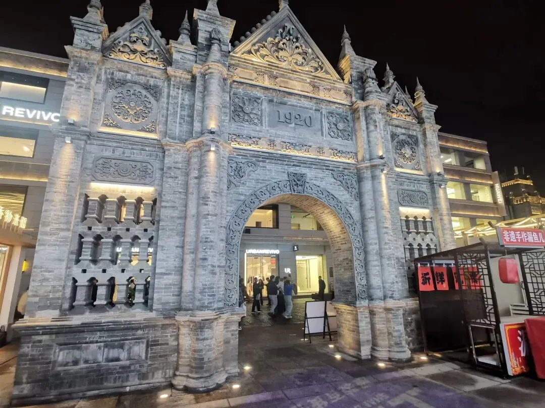 朋友推荐的老太原菜馆,我们早已在网上预约,但仍要等候二十多桌,索性不慌,一路沿街闲走。暖黄的灯带沿着飞檐蜿蜒铺开,串串红灯笼垂落下来,与市井的霓虹交相辉映。路过刻着“1920”的复古拱门,砖雕纹路在灯光下格外清晰,忍不住驻足、留影。一旁UR店铺的灯光通透明亮,清冷而现代,与青砖小楼的暖黄柔光遥遥相对。新与旧,繁华与古朴,就这样并肩立着,毫无违和。