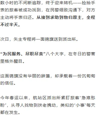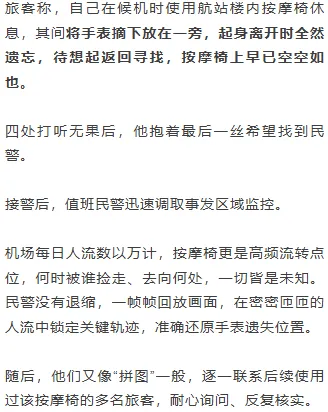 日前,太原武宿国际机场航站楼内上演暖心一幕:一名旅客紧紧握住民警的手,连声道谢。就在几个小时前,他还因一块不慎遗失的贵重手表心急如焚。