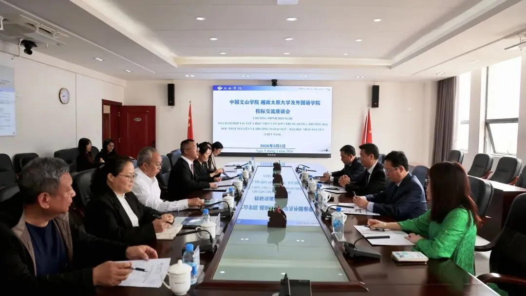 在校际交流座谈会上,文山学院副校长汤龙从学科建设、科研创新、国际交流等方面系统介绍学校发展概况。太原大学外国语学院副校长刘光创、越南太原大学科学技术与对外合作处处长梅英科分别就深化两校未来合作提出建议。双方围绕中文教育、科研协作、学生联合培养等领域深入沟通、广泛交流,达成多项合作共识。