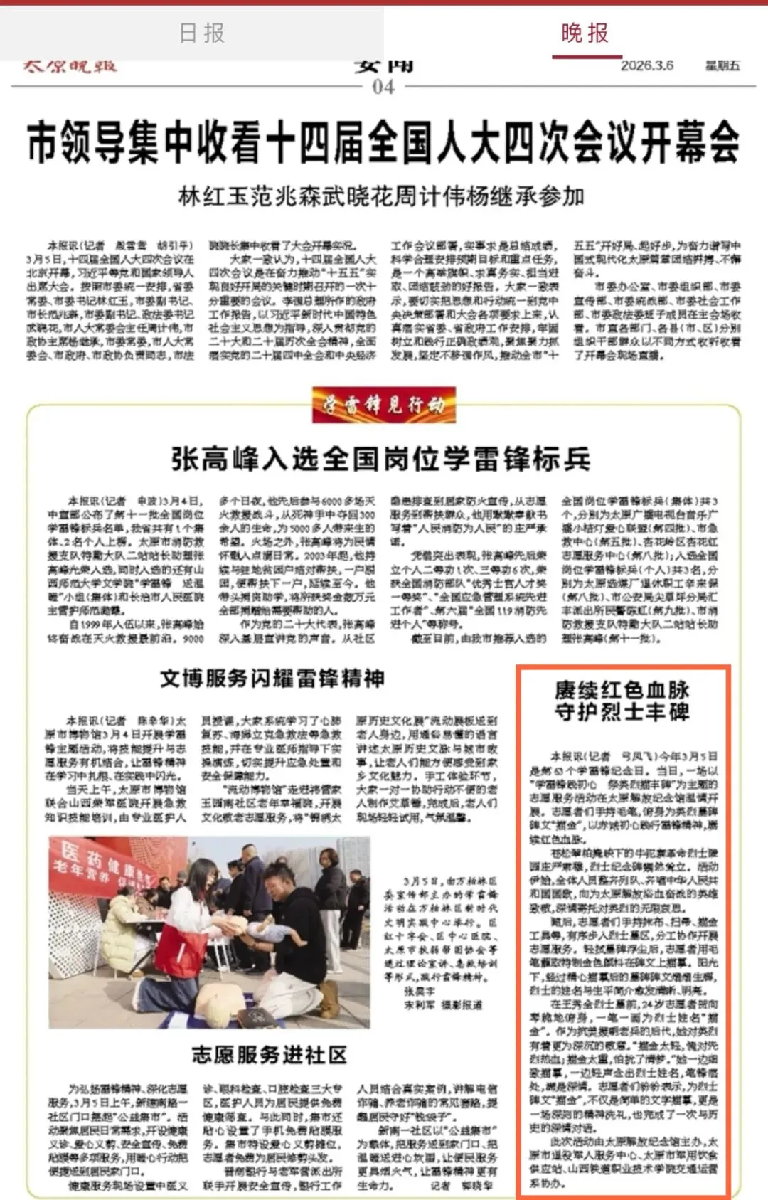 本报讯(记者 弓凤飞)今年3月5日是第63个学雷锋纪念日。当日,一场以“学雷锋践初心 祭英烈描丰碑”为主题的志愿服务活动在太原解放纪念馆温情开展。志愿者们手持毛笔,俯身为英烈墓碑碑文“描金”,以赤诚初心践行雷锋精神,赓续红色血脉。