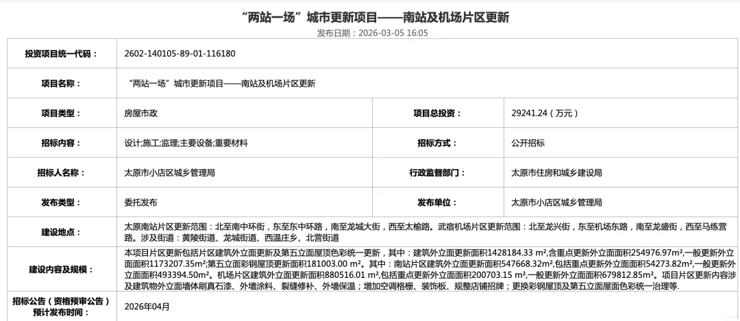 城市更新,是城市发展到新阶段的必然选择,更是提升城市能级、增进民生福祉的关键举措。2026年1月发布的《太原市城市更新专项规划(公示稿)》,以5年为规划期限。太原城市更新以 “一城、一湖、两站、四区” 八大核心板块为引领,聚焦居住提质、交通畅行、产业升级、文化复兴、生态修复、智慧治理六大方向,目标是建设国家区域中心城市、再现 “锦绣太原城” 盛景。3月5日,全国公共资源交易平台发布了《“两站一场”城市更新项目——南站及机场片区更新》招标公告,具体如下:建设地点:太原南站片区更新范围:北至南中环街,东至东中环路,南至龙城大街,西至太榆路。武宿机场片区更新范围:北至龙兴街,东至机场东路,南至龙盛街,西至马练营路。涉及街道:黄陵街道、龙城街道、西温庄乡、北营街道建设内容及规模:本项目片区更新包括片区建筑外立面更新及第五立面屋顶色彩统一更新,其中:建筑外立面更新面积1428184.33 m²,含重点更新外立面面积254976.97m²,一般更新外立面面积1173207.35m²;第五立面彩钢屋顶更新面积181003.00 m²。其中:南站片区建筑外立面更新面积547668.32m²,包括重点更新外立面面积54273.82m²,一般更新外立面面积493394.50m²。机场片区建筑外立面更新面积880516.01 m²,包括重点更新外立面面积200703.15 m²,一般更新外立面面积679812.85m²。项目片区更新内容涉及建筑物外立面墙体刷真石漆、外墙涂料、裂缝修补、外墙保温;增加空调格栅、装饰板、规整店铺招牌;更换彩钢屋顶及第五立面屋面色彩统一治理等.招标公告(资格预审公告) 预计发布时间:2026年4月上述“两站一场”城市更新项目对应《太原市城市更新专项规划》:1、“两站” 板块:高铁南站