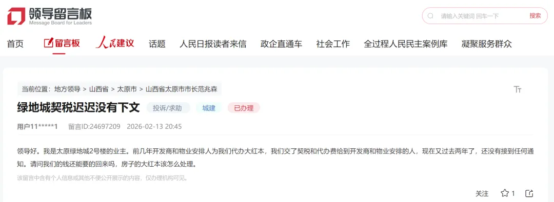 记者从人民网领导留言板获悉,太原市绿地城2号楼的业主反映:前几年开发商和物业安排人为业主代办大红本,业主交了契税和代办费给到开发商和物业安排的人,现在又过去两年了,还没有接到任何通知。