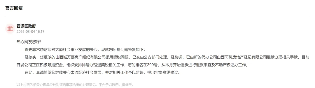 网友反映太原市一小区契税问题,官方回应:原公司挪用!