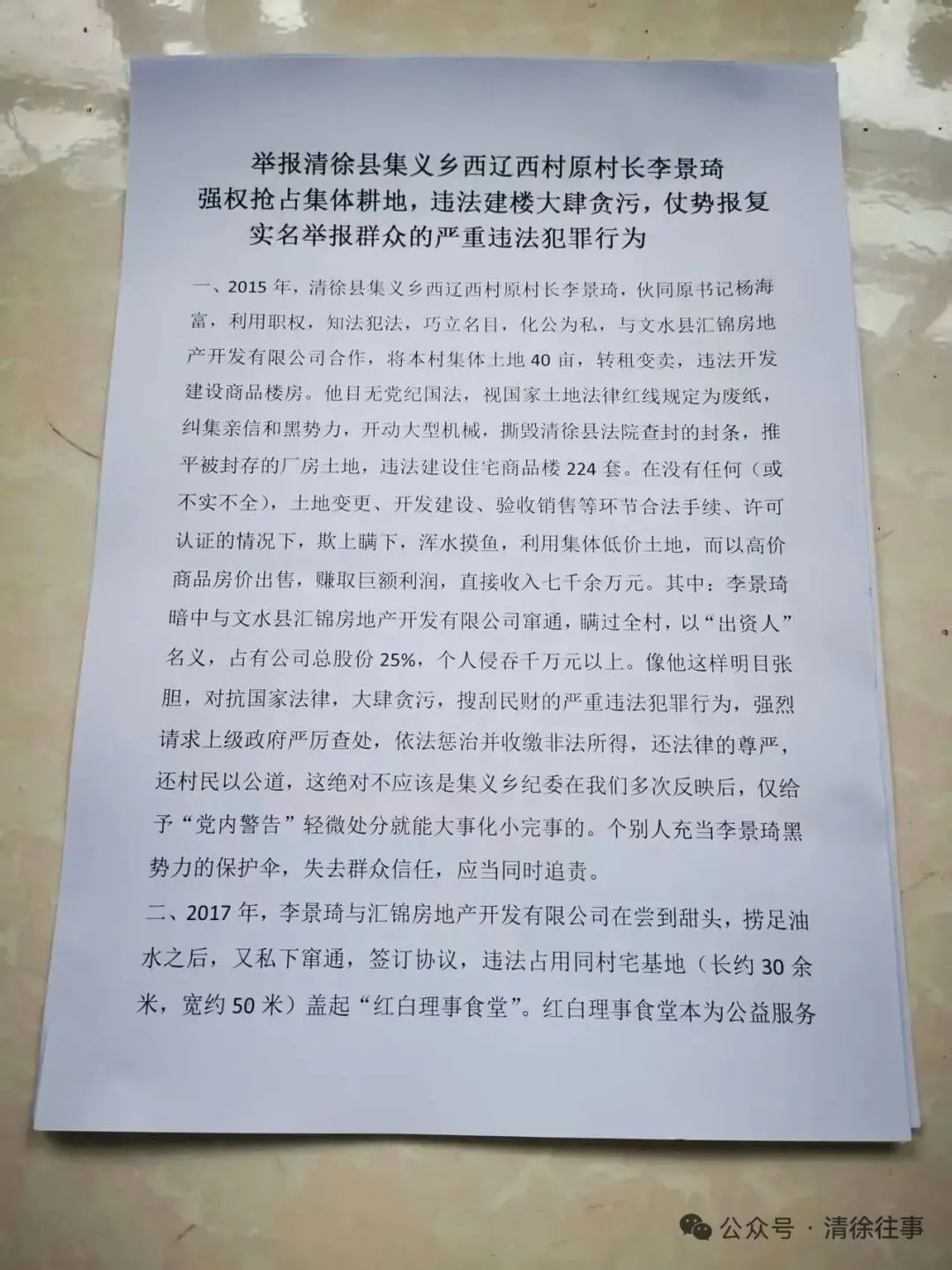 清徐县集义乡西辽西村原村长李景琦被指强权抢占集体耕地、违法建楼、大肆贪污,甚至仗势报复实名举报群众,这样的行为,无疑是对基层治理秩序的公然践踏,对群众切身利益的粗暴侵害,其性质之恶劣,令人发指。