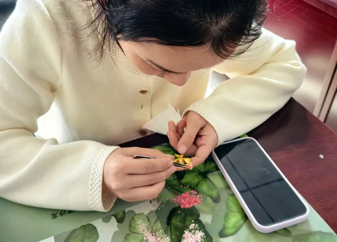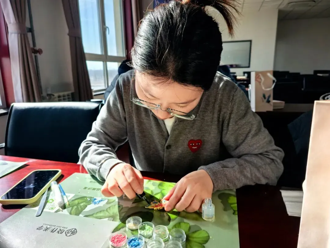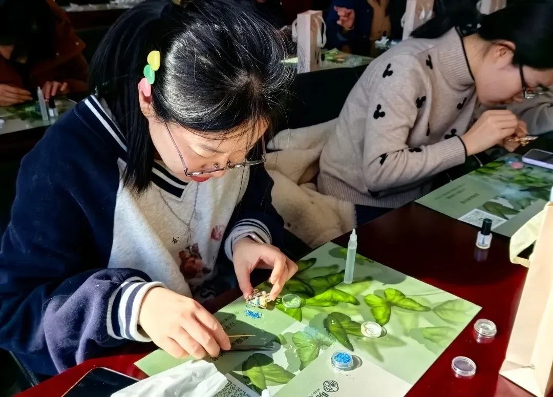 公司工会为每位参与者精心准备了胸针底托、螺钿贝壳片、胶水、镊子等全套手工材料。在老师指导下,女职工们专注投入,化身巧匠。一枚枚构思独特、闪耀光泽的螺钿胸针在她们手中相继诞生。大家欣喜佩戴,相互欣赏、合影留念,现场洋溢着满满的成就感和幸福氛围。