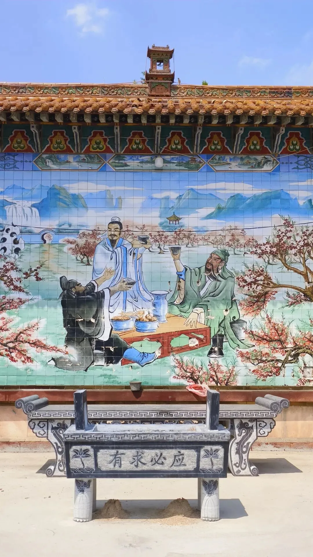 据传,旧时此处有关帝庙,供奉关羽,兼祀刘备、张飞,以“桃园结义”“忠义千秋”教化乡民。老庙历经岁月消失后,村民在原址重建照壁,将三结义故事绘于壁上,以壁代庙,延续香火与文脉。