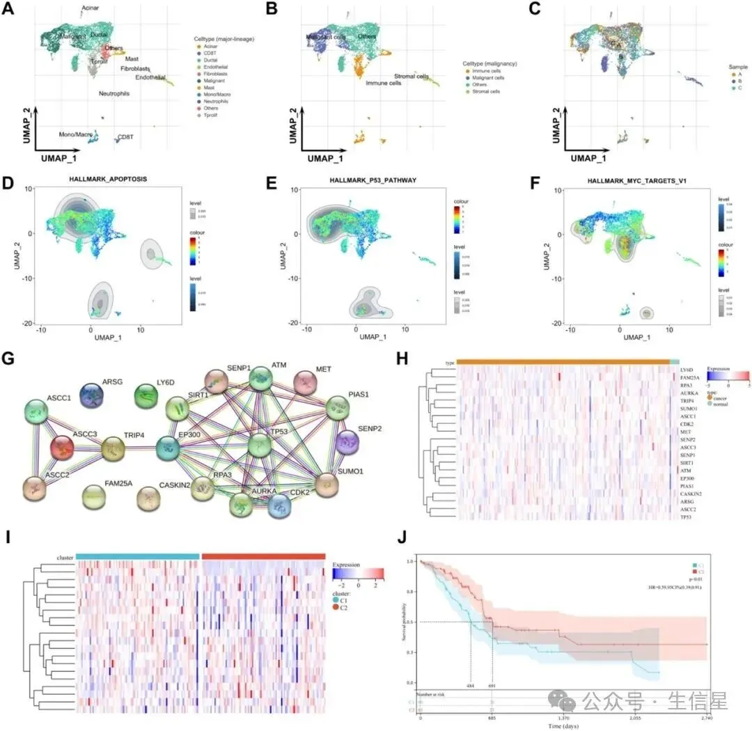 (1)scRNA-seq分析:基于PDAC患者的公共单细胞转录组数据,筛选出20个关键驱动基因;通过一致性聚类将PDAC患者分为两个亚型(C1和C2),并分析其在免疫浸润模式和总生存结果上的差异,发现C1亚型患者的总生存率显著低于C2亚型,表明C1亚型具有更差的预后。